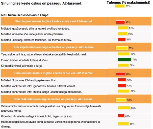 Iga õpilane saab tagasiside keeletaseme saavutamise kohta protsentuaalselt, samuti antakse tagasisidet iga hinnatava osaoskuse kohta eraldi lähtuvalt raamdokumendi tasemekirjeldustest. Kui tulemus on vahemikus 70–100%, on õpilane jõudnud A2-tasemele ja tulemus kuvatakse rohelisega. Kui tulemus on vahemikus 50–69%, on õpilane peaaegu jõudnud A2-tasemele ja tulemus kuvatakse kollasega. Kui tulemus jääb alla 50%, ei ole õpilane veel A2-tasemele jõudnud ja tulemus kuvatakse punasega.