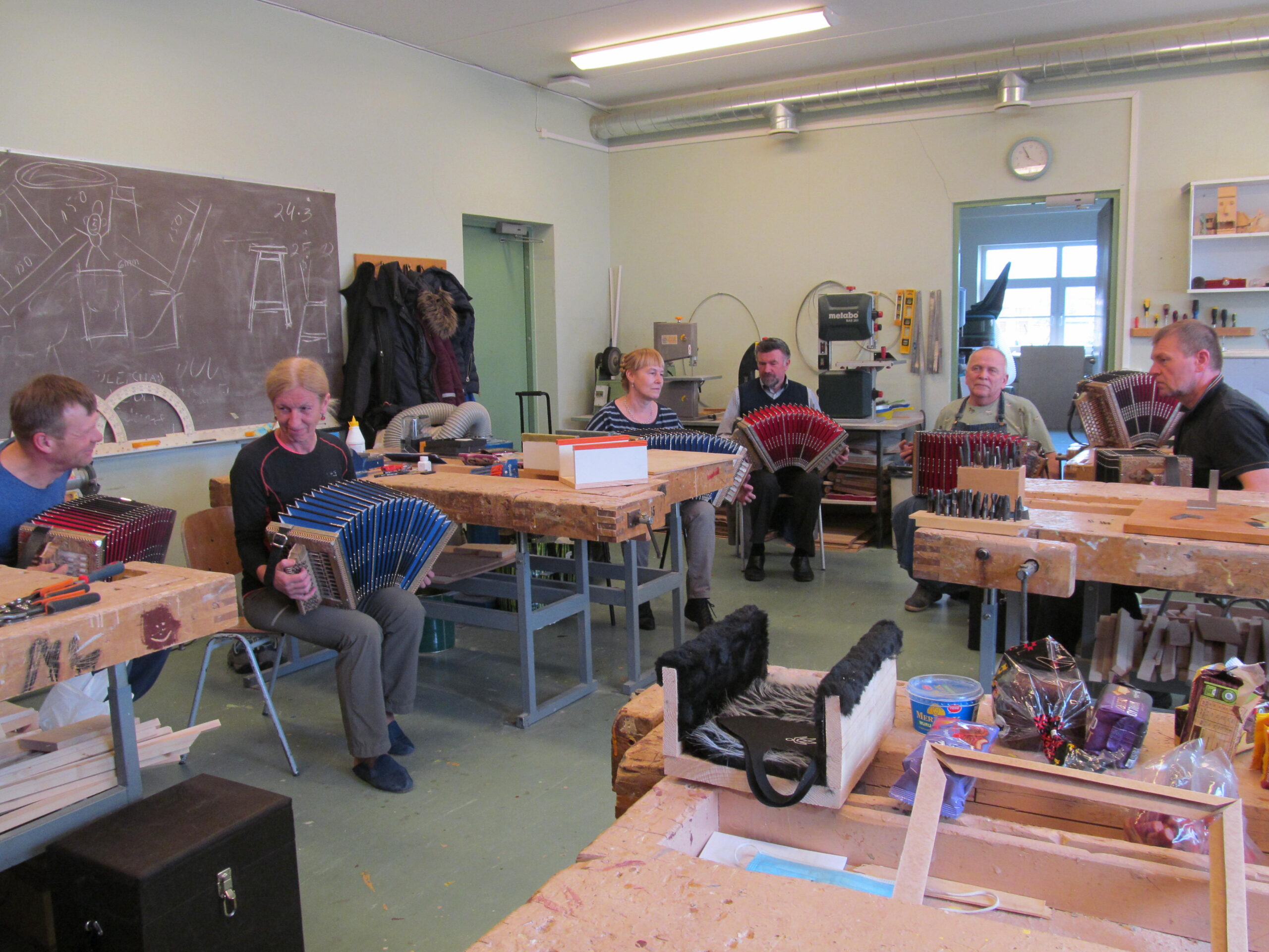 Pidulik hetk, mil esmakordselt kõlavad kokku kuus uhiuut lõõtspilli. Neil mängivad Jaanus Orgusaar, Reet Jaaniste, Kaja Jõerand-Vahur, Mati Sutt, Mati Ulm ja Märt Leesment. Fotod: Annika Poldre