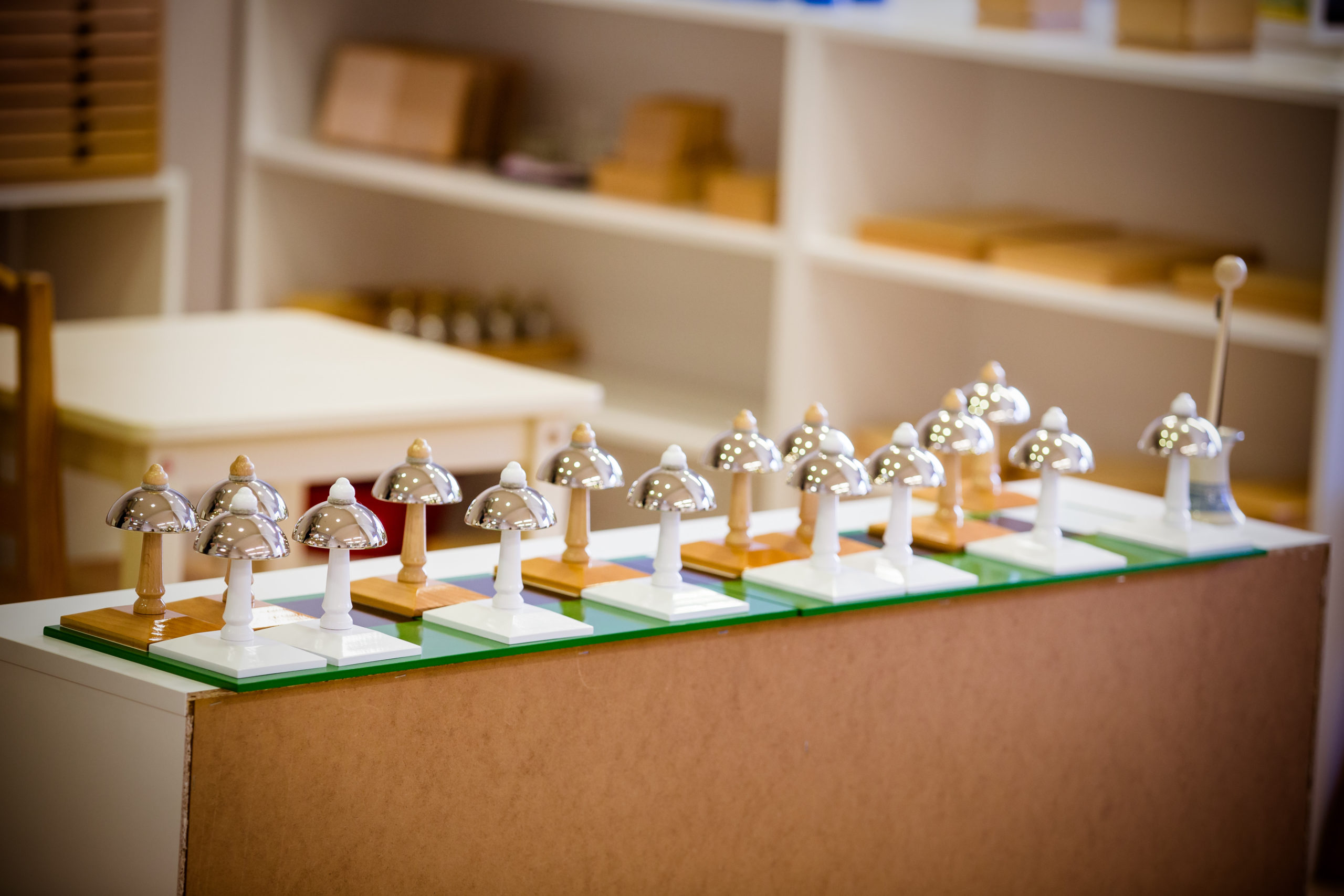 Kuulmismeele arendamiseks on rühmas helitopsid ja kellad. Topsid on muidu äravahetamiseni sarnased, kuid raputades teevad eri valjusega heli. Laps peab kuulmise järgi sarnase valjusega paari kokku panema. Sarnaselt tegutseb laps kelladega, kuid neist moodustuvad paarid helikõrguse järgi.