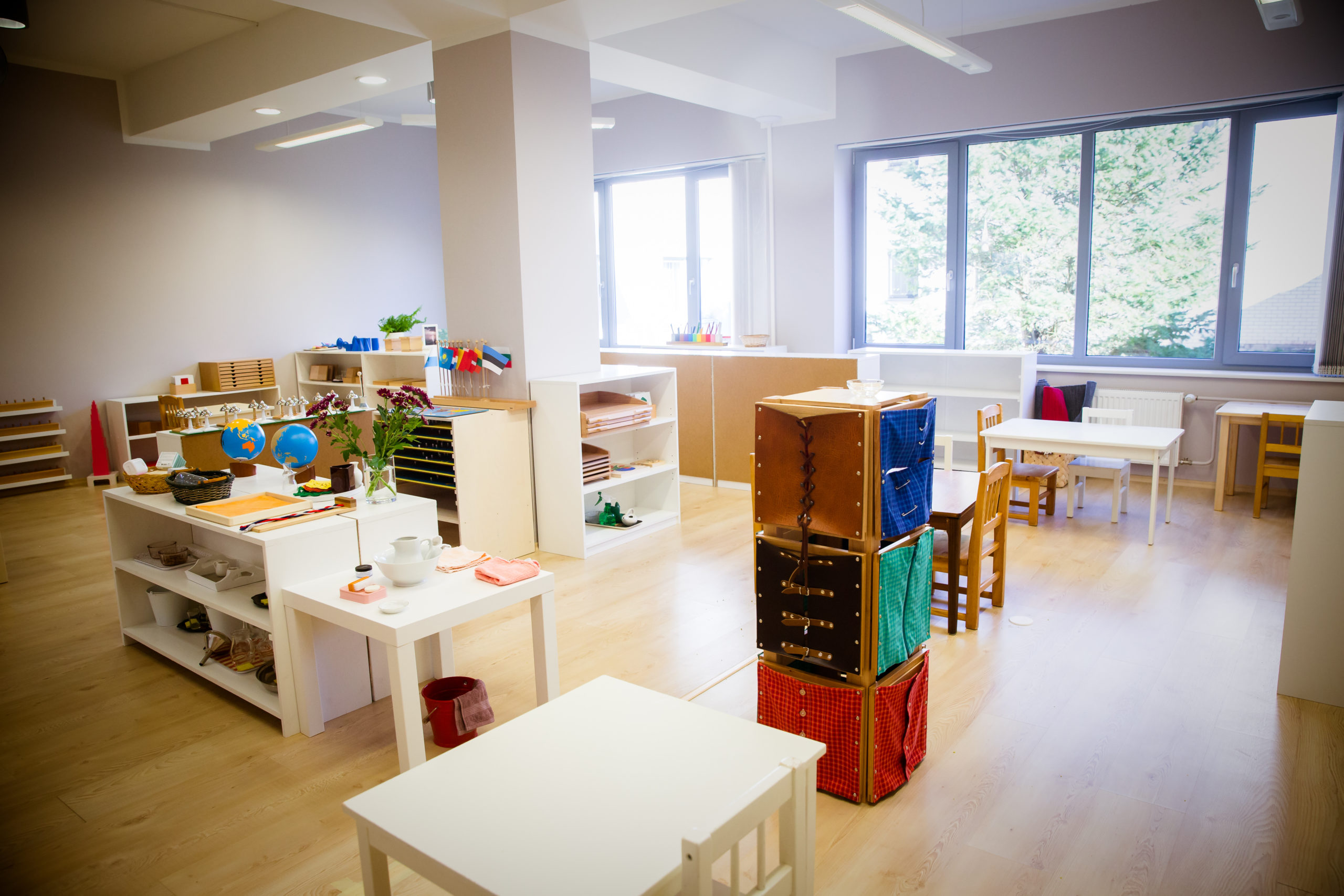 Montessori rühmaruumis on tunne nagu teaduskeskuses: avatud riiulitel on väga palju vahendeid, üks põnevam kui teine. Ruum on jagatud viieks ainealaks: igapäevaelu, meeled, emakeel, matemaatika ja kultuur.