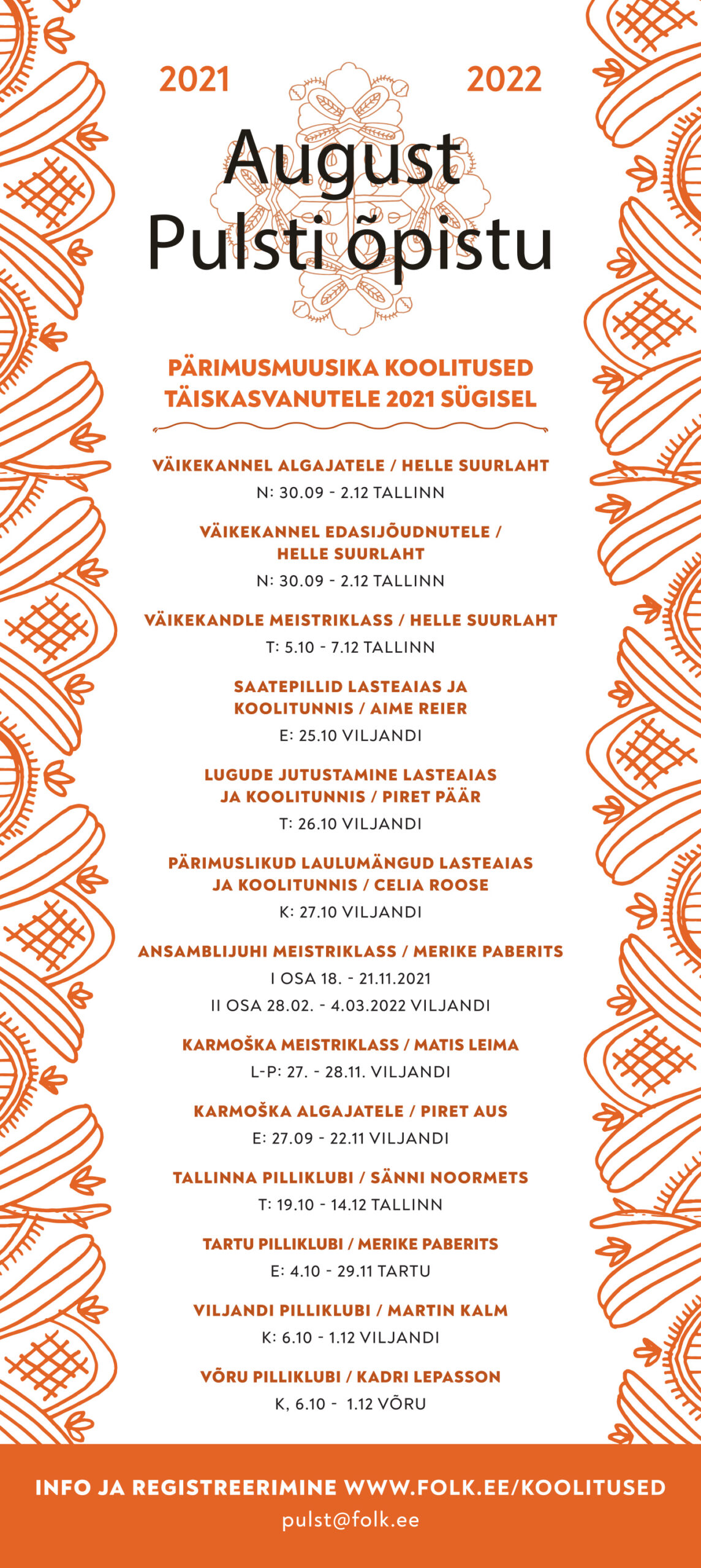 August Pulsti õpistu pärimusmuusika koolitused täiskasvanutele 2021 sügisel