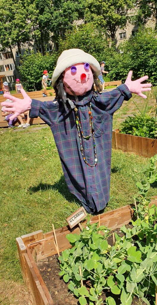 Lastel on õues põnev oma taimekastide eest hoolitseda. Enamik saaki veel kasvab, aga näiteks Klaabude rühma herned said juulis söödud. Herned kasvasid jõudsalt ehk ka seepärast, et neil oli aias üks isemoodi valvur – hernehirmutis Petja.