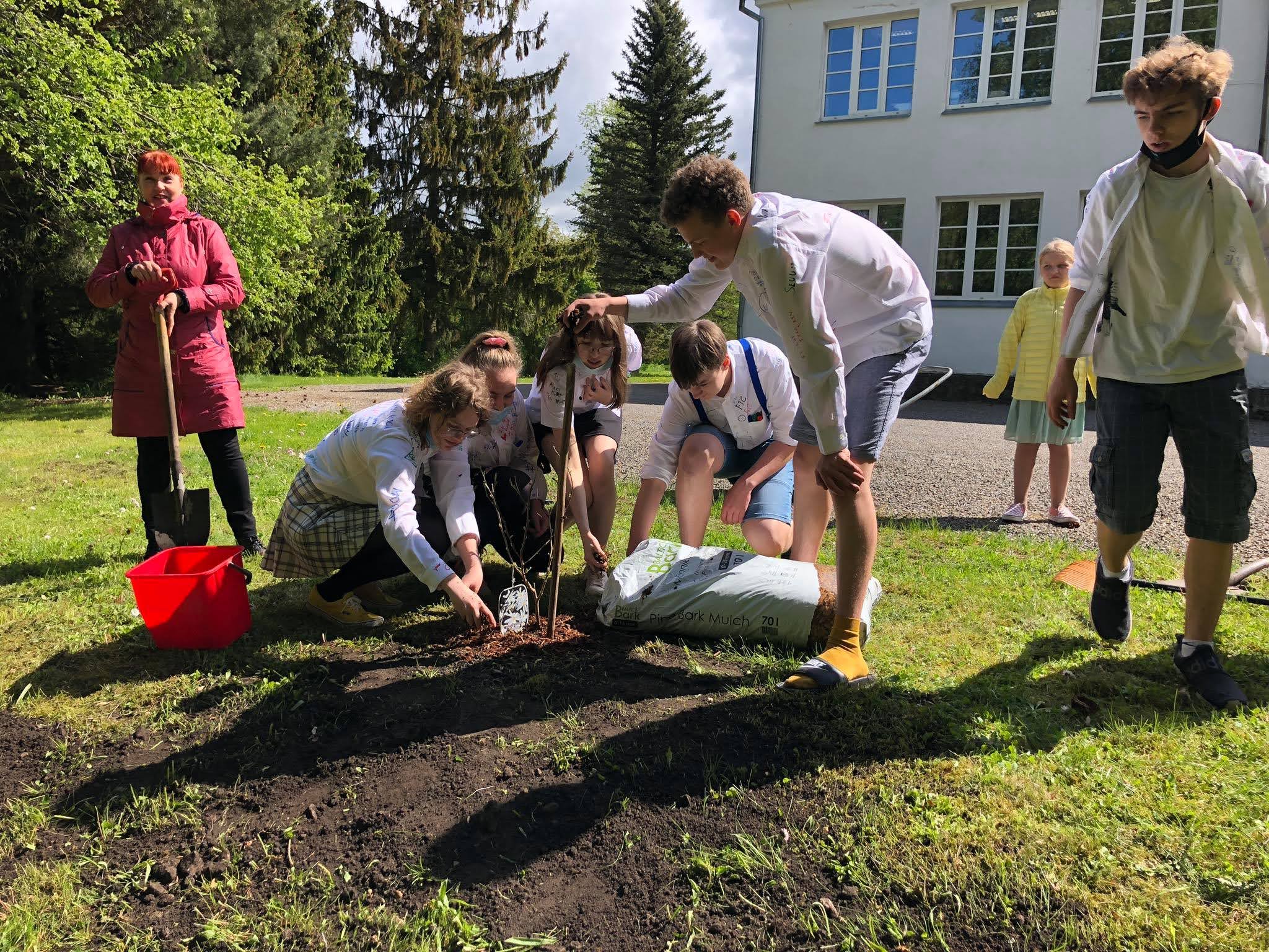 2021. a lõpuklassi õpilased koos klassijuhataja Maret Mägiga puud istutamas. Vasakult Hanna-Liis Zenkevics, Mia Maria Maripuu, Sandra Mustis, Aramis Kaljuste, Oliver Valk, Oskar Link. Foto: Liisi Katariina Verk