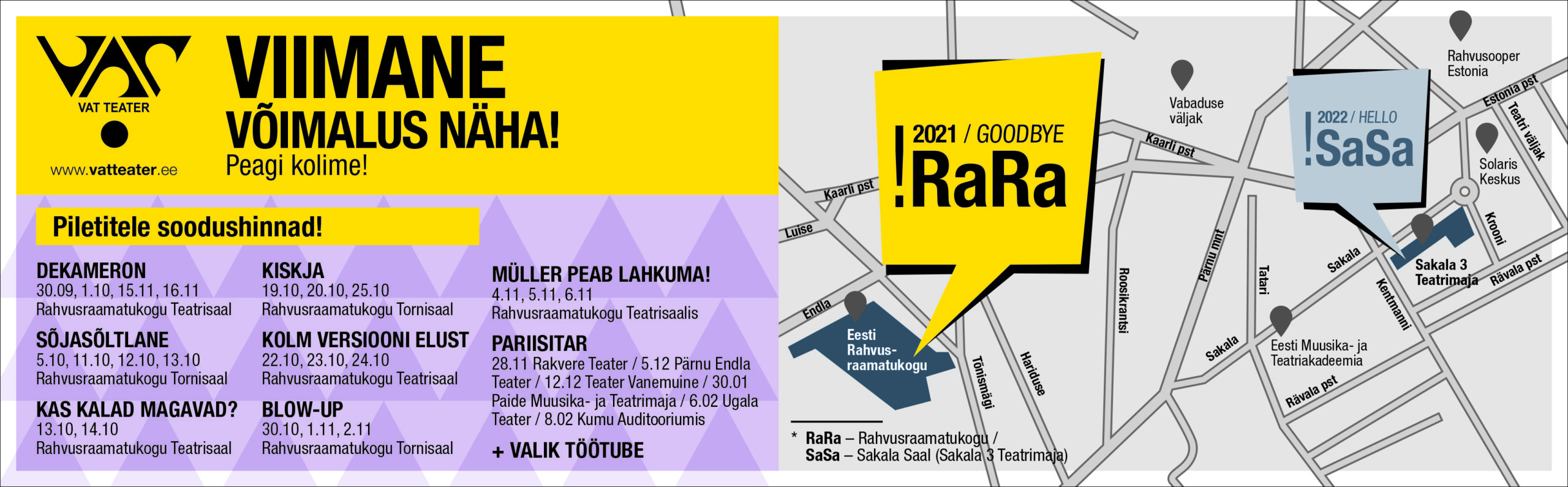 Kuna jaanuarikuus kolime rahvusraamatukogust selle remontimineku tõttu välja ning seame end sisse Sakala 3 teatrimajas, pakume oma sõpradele veel viimast võimalust vaadata meie väärt lavastusi, mida me uude asupaika kaasa ei võta.