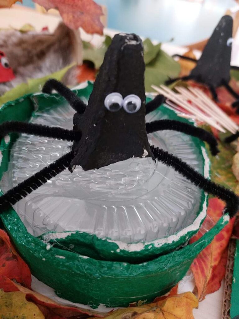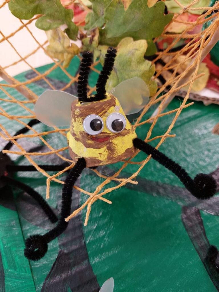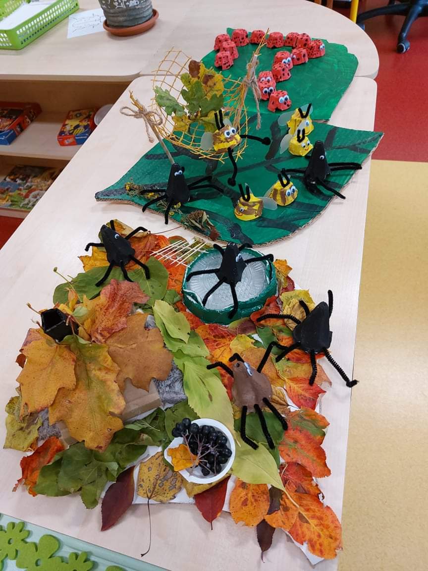 Krõlli rühmas meisterdasid lapsed munarestidest lepatriinusid, ämblikke ja mesilasi ning värvisid need üle guaššide ja akrüülvärvidega. Kui putukad valmis said, oli neile ka alust vaja. Õpetaja Inna Ramul lõikas papist välja kolm suurt lehte ja värvis need roheliseks.