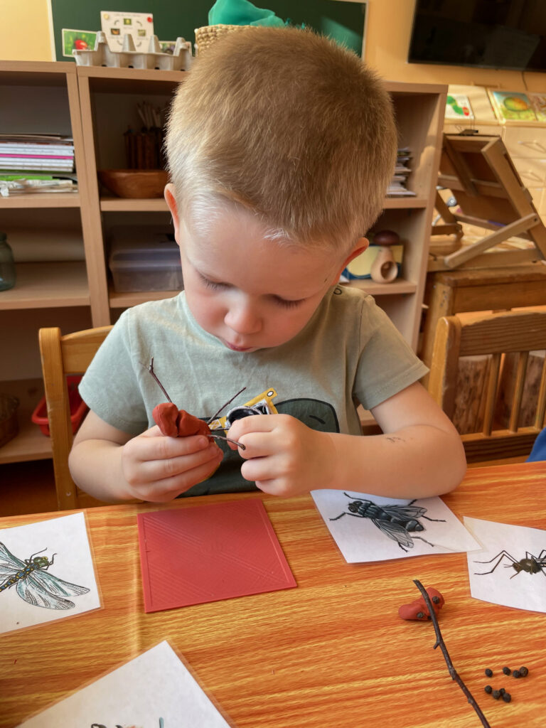 Putukate meisterdamiseks valmistasime koos soolataigna – lapsed ise mõõtsid kaussi jahu ja soola ning lisasid vett, kuni tekkis jahuvärvi mass, millest nad voolisid putukaid ja putukate pesi ning värvisid need üle. Putukate pesade jaoks käisime lisaks pargist oksi, sammalt, lehti ja tammetõrusid korjamas. Tööd tulid väga toredad, nagu väikesed skulptuurid. Näiteks üks tüdruk pani oma tööle nimeks „Liblikas, kes sööb kooki“. Kuigi kolmeaastased on veel väikesed, tegi igaüks oma töö ise ja need kõik on isemoodi. Aga meie töö ei ole veel lõppenud.“