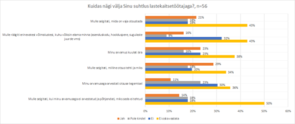 Uuringu tulemustest selgus, et avatud dialoogi peetakse lapsega pigem vähe ning paljusid lapsi siiski ei kaasata neid puudutavate otsuste langetamisesse. On arusaadav, et võib tekkida olukord, kus mingisugusel põhjusel tehakse otsus, mis ei ühti lapse soovidega. Seda enam on äärmisel oluline, et laps oleks kaasatud ning talle selgitataks, miks selline otsus langetati. Jooniselt 2 on näha, et suur osa lapsi ei ole kindel või ei oska küsimusele vastata. Ka intervjuudest selgus, et paljud lapsed tõlgendavad olukordi täiskasvanutest erinevalt ning tihtipeale ei mõista, kui nad erinevaid meetodeid kasutades on kaasatud. Seejuures on oluline meeles pidada, et last saab teadlikult kaasata vaid lapsega arvestaval ja eakohasel viisil, mis toimub tema arengule vastavalt ja temale arusaadavas keeles.