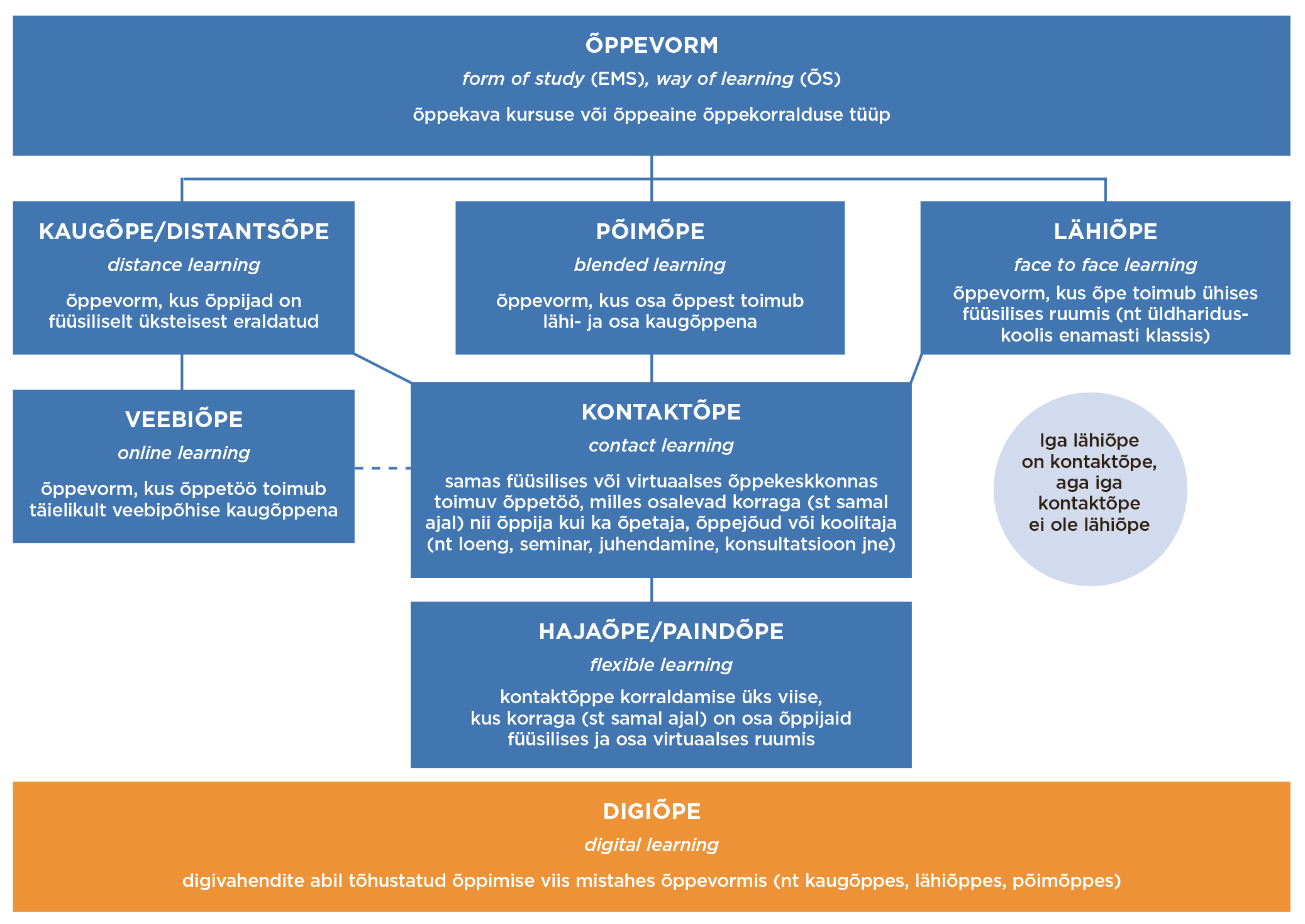 Jooniselt leiab veel kaks terminit: veebiõpe ning digiõpe. Veebiõpe ehk veebipõhine õpe on kaugõppe vorm, milles kasutatakse õppetegevuste korraldamiseks internetti. Veebiõpe võib, aga ei pruugi olla kontaktõpe. Digiõpe ehk e-õpe on digivahendite kasutamine õppetöös, mis võib toimuda nii lähi-, põim-, paind- kui ka veebiõppes. Terviklikkusele rõhudes võiks terminina tuua juurde ka koduõppe, kuid digiterminoloogiliselt jääb see praegusest fookusest kõrvale.