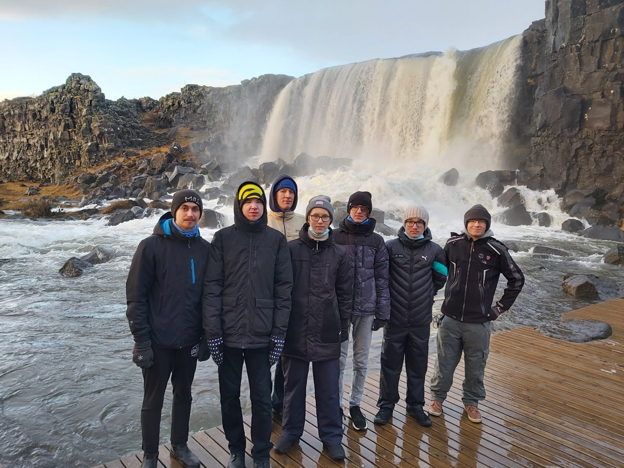 Eesti võistkond koos juhendajatega Öxarárfoss veejoa juures. Foto: erakogu