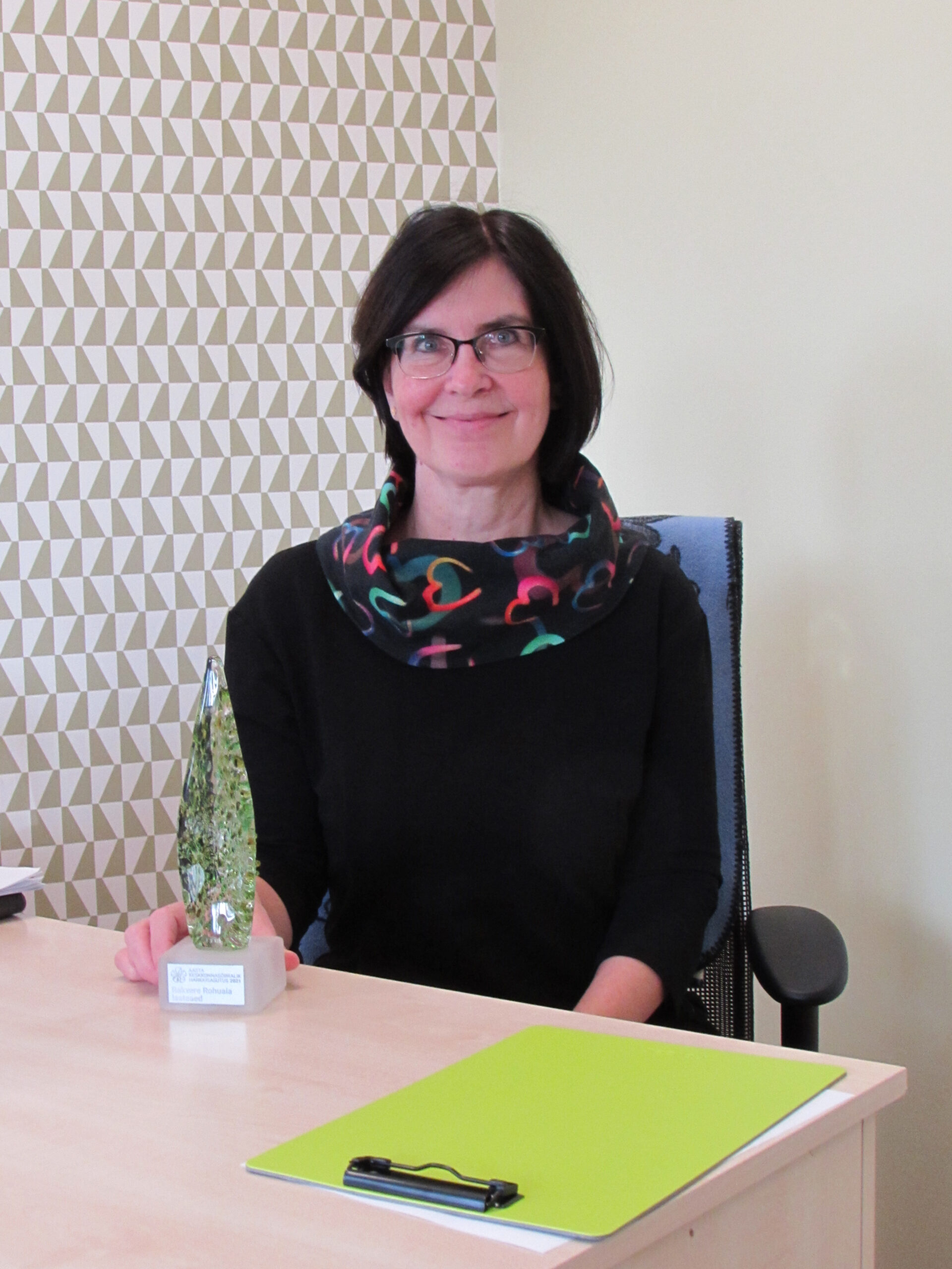 Rakvere Rohuaia lasteaia direktor Ene Nool keskkonnategude tunnustussündmuselt saadud auhinnaga. Foto: Tiina Vapper