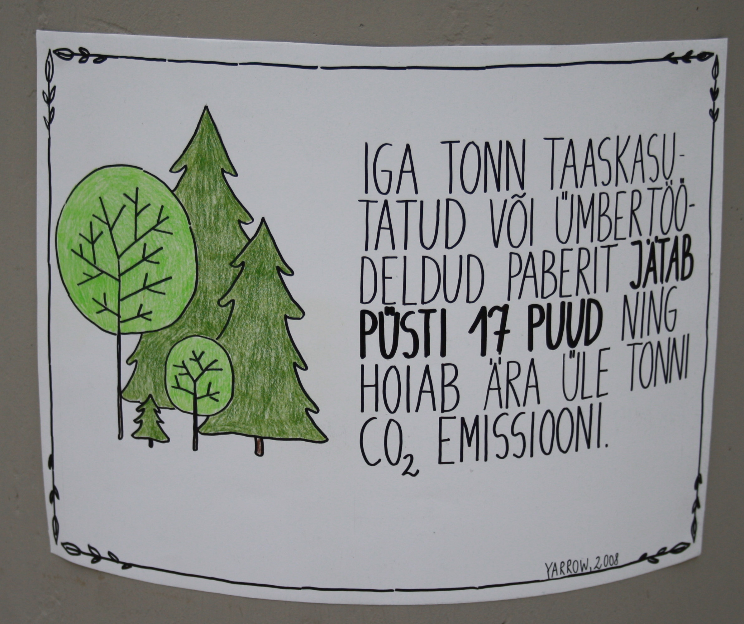 Tänu õpetajate tehtud veebilehele „Puud lasteaia õuealal“ tunnevad lapsed kõiki õuel kasvavaid puid: haaba, kadakat, kaske, kastanit, kuuske, mändi, pihlakat, pärna, tamme, vahtrat ja õunapuud. Seintel on väljas info aasta looma, linnu, kala ja putuka kohta ning saab lugeda õpetlikke rohelisi sõnumeid.