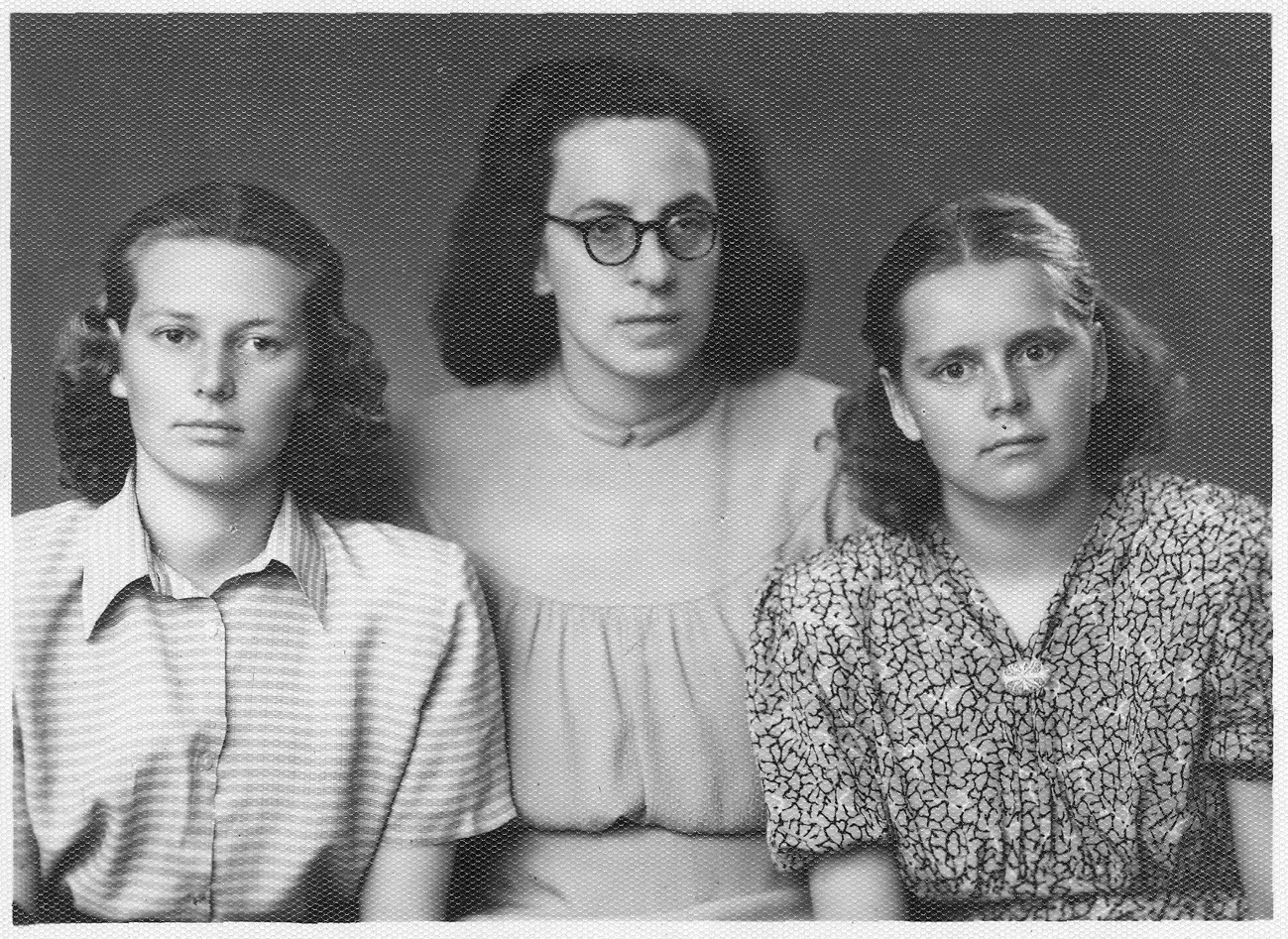 Erna Saar oma klaveri eriala õpilastega Tallinna Muusikakooli päevilt. Maaja Reinaste vasakul ja Eevi Ross paremal.