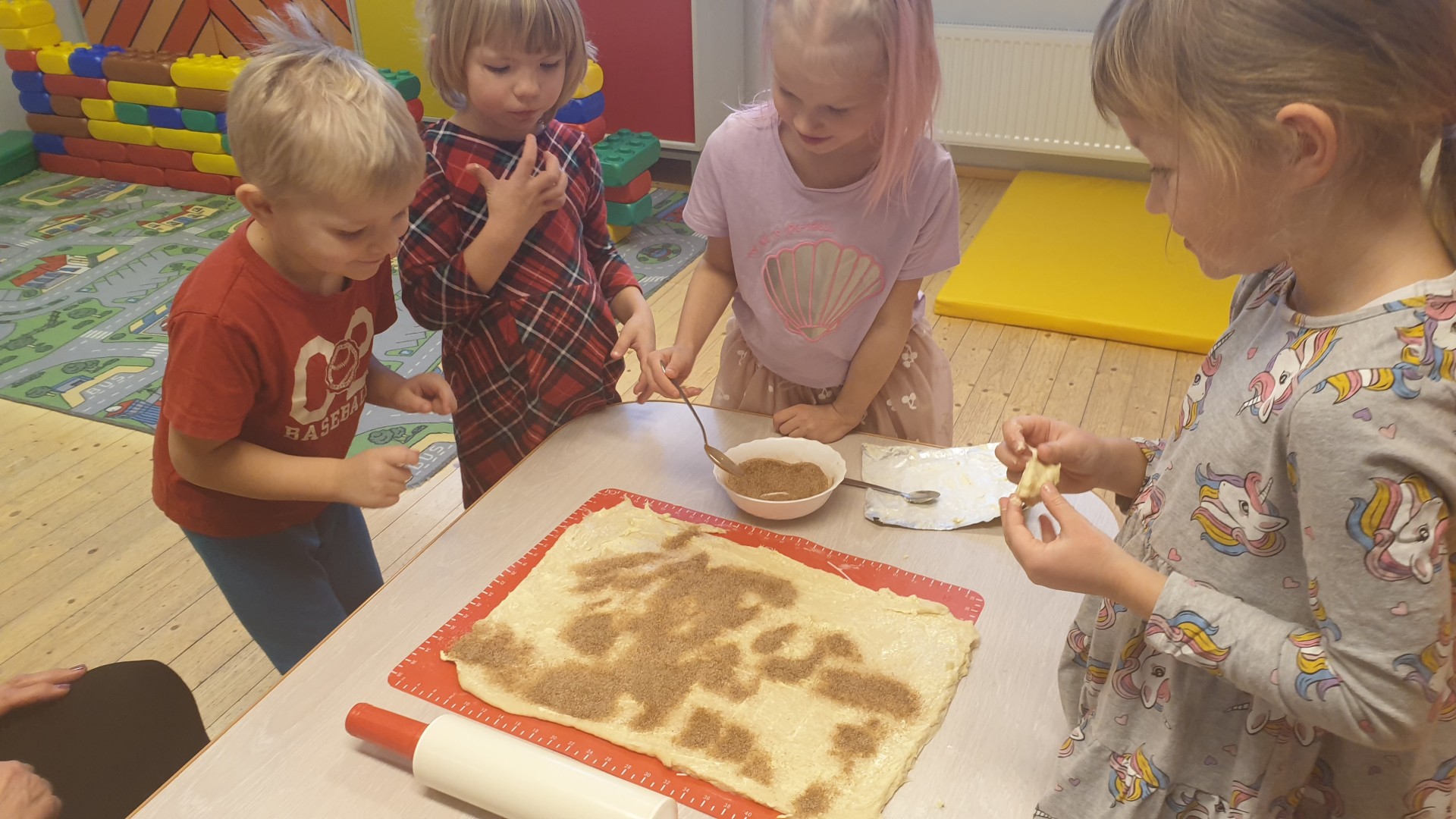 Esimest adventi tähistasime, lauldes koos jõulu- ja talvelaule. Üks õpetaja saatis kitarril ja lapsed laulsid kõik kenasti kaasa. Rühmadel on loomade nimed – Mõmmide, Siilide, Oravate ja Jäneste rühm – ja pärast laulmist pani iga rühm oma nimelooma juurde seinale esimese advendiküünla. Ka päkapikud olid kuuse alla üllatuse poetanud.