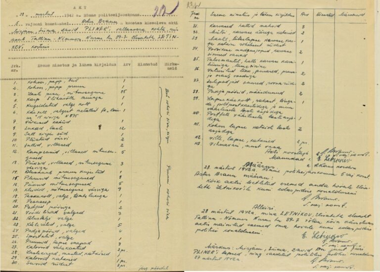 Mõrvapäeval külastas poliitilise politsei ametnik Litzenko korterit. Reeglite järgi tuli juutide omand üles kirjutada. Sündis 43 esemest koosnev loend Plineri surnud lastest järele jäänud mänguasjadest ja rõivastest, mis anti üle Eesti Ühisabile. Kus ja mil moel kolm süütut last mõrvati ja mida nad neli kuud vanglas enne surma üle elasid, võib ainult oletada, sest arhiividokumendid sellest vaikivad7. Selliseid lugusid, mis põhinevad Eesti Rahvusarhiivi säilikutel ja Eesti Juudi Muuseumi materjalidel, on mitmeid.