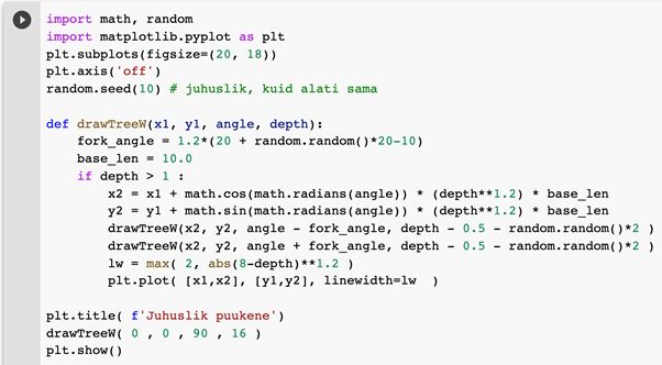 Joonis 1: Informaatika õppimise saab lihtsate praktiliste ülesannetega väga piltlikuks ja põnevaks muuta. Tegemist on lihtsa programmiga, mis joonistab üksteise järel puuharusid. Iga haru hargneb kaheks ja lüheneb; haru paksus on alguses ja lõpus jämedam (tüvi ja lehed) ja keskel peenem (oksad). Põhikooliõpilane suudab sellises programmis väikseid muutusi sisse viia ja nende mõjuga katsetada.