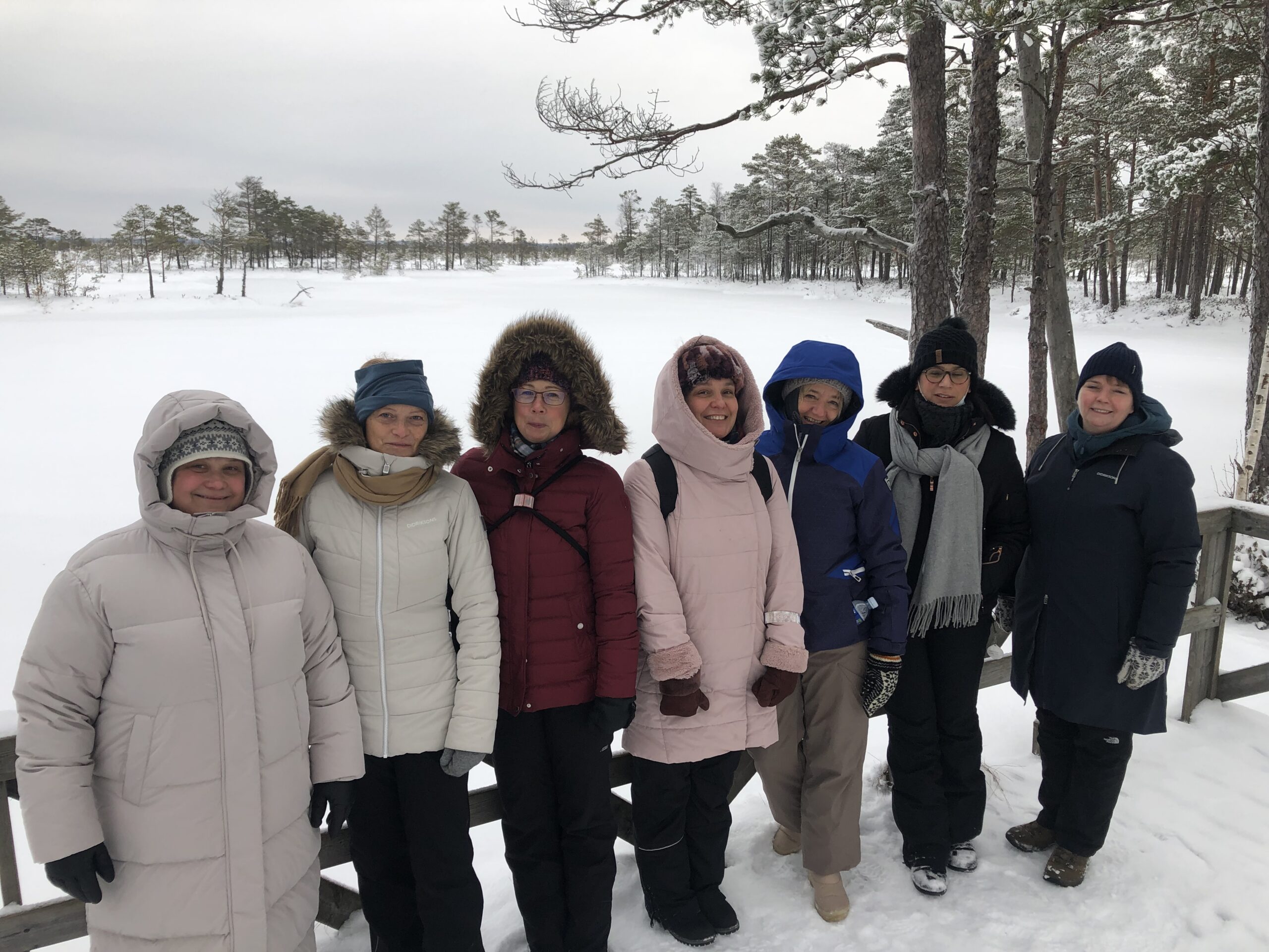Külalised koos Eesti saatjatega Tolkuse rabas: vasakult Marika Alavere, Nanna Þórhallsdóttir, Kuninga t kooli klassiõpetajad Inga Merisaar ja Katrin Kurvits, Isabelle Galau, Soizic Navarro, Birna Kristín Friðriksdóttir. Kui võõramaalastele oli raba ehe eksootika, siis ka Marika Alavere tunnistas, et polnud talvel varem rabas käinud. Foto: Liina Õmblus