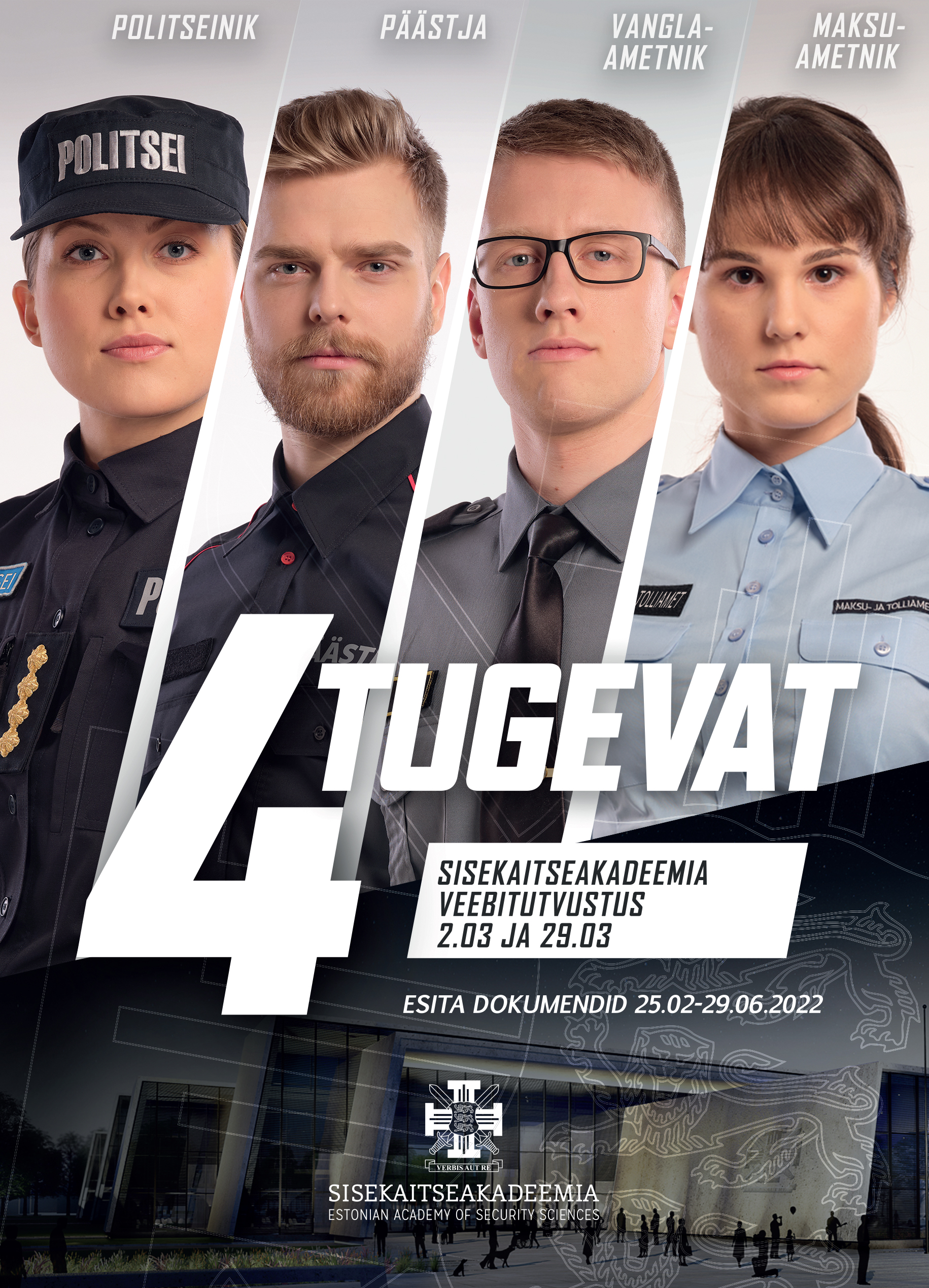 Sisekaitseakadeemia tutvustus veebikeskkonnas Zoom toimub 2. märtsil kell 11 ja 29. märtsil kell 15. Tutvustame õpetatavaid erialasid, räägime vastuvõtust, näitame peahoonet ja vastame küsimustele.