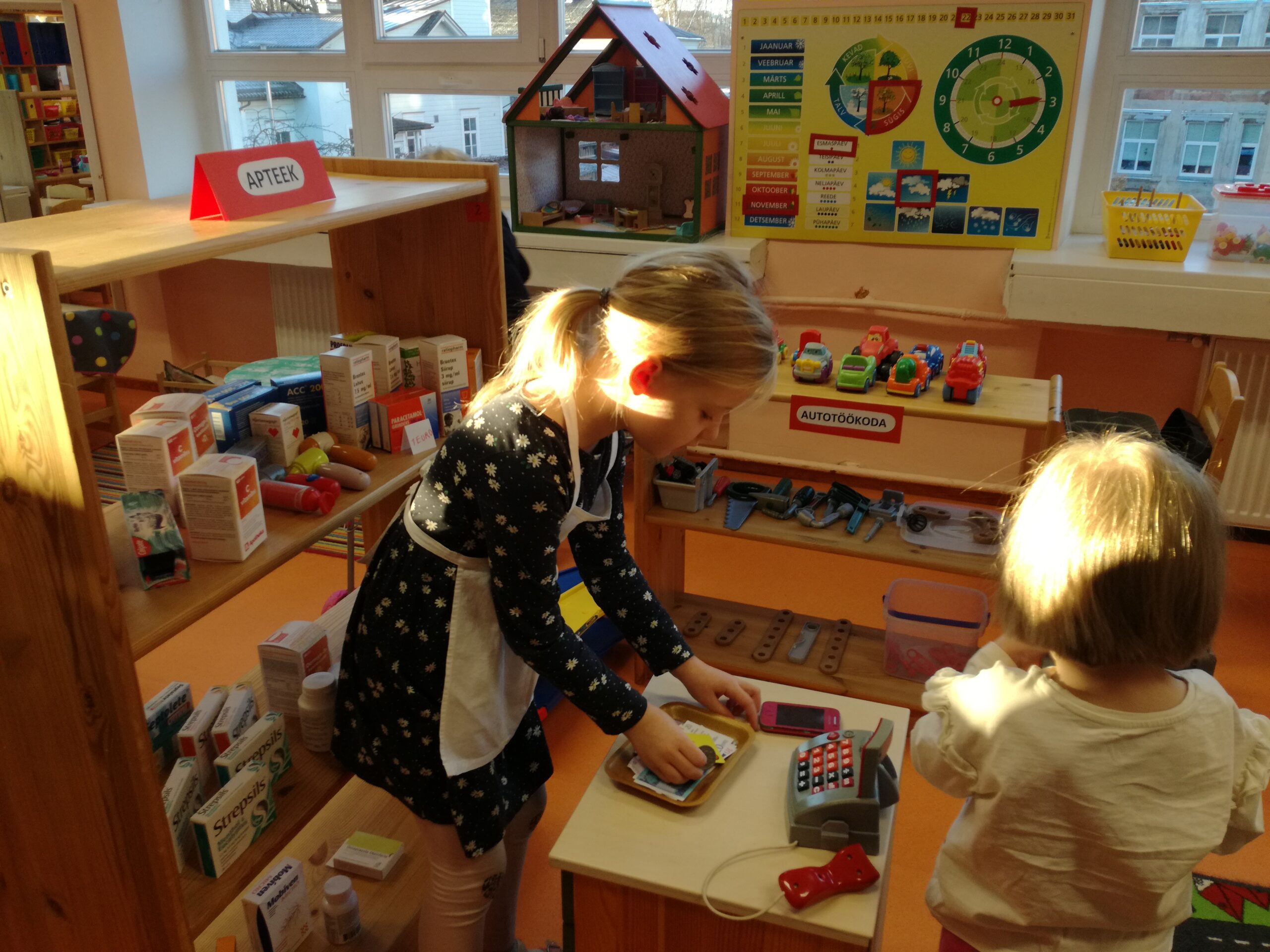 Meie rühmas käivad lapsed vanuses kaks kuni seitse aastat ja uskuge mind, poodi mängides ei ole vahet, kui vana on müüja, kõik saavad oma rolliga suurepäraselt hakkama. Hea on näha, kuidas lapsed selgitavad üksteisele mängu olemust, sealjuures üksteist abistades ja toetades.