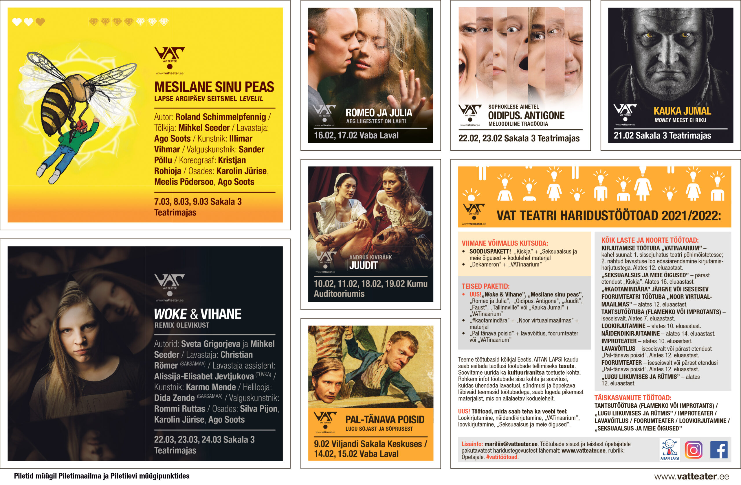Vanadest tegijatest jätkavad „#kaotamindära“ ja „Pál-tänava poisid“ paketis foorumteatri ja lavavõitluse töötoaga. „VATinaarium“ laieneb veelgi enamate lavastuste juurde: „Oidipus. Antigone“, „Romeo ja Julia“, „Tallinnville“ „Juudit“, „Kauka jumal“ ja „Faust“. Mõnda töötuba saab teha ka veebi teel: lookirjutamine, näidendikirjutamine, „VATinaarium“, loovkirjutamine ning „Seksuaalsus ja meie õigused“.