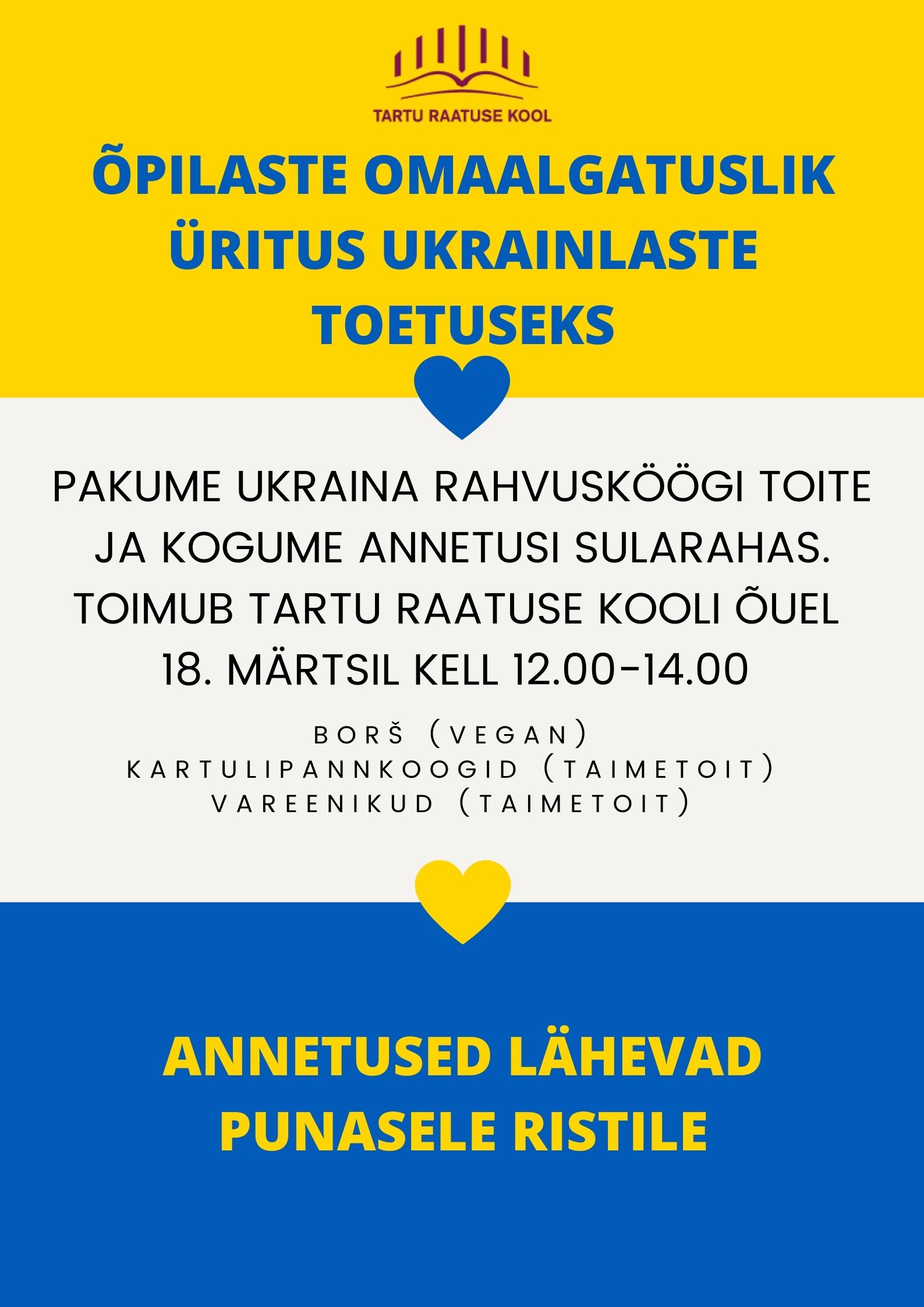 Reedel, 18. märtsil kl 12‒14 toimub Tartu Raatuse Kooli õuealal õpilaste ellukutsutud heategevuslik üritus, mille käigus pakutakse inimestele Ukraina rahvusköögist tuttavat boršisuppi, kartulipannkooke ja vareenikuid. Eriliseks muudab toidu asjaolu, et supp valmistatakse veganretsepti järgi ning küpsetised sobivad ka taimetoitlastele.