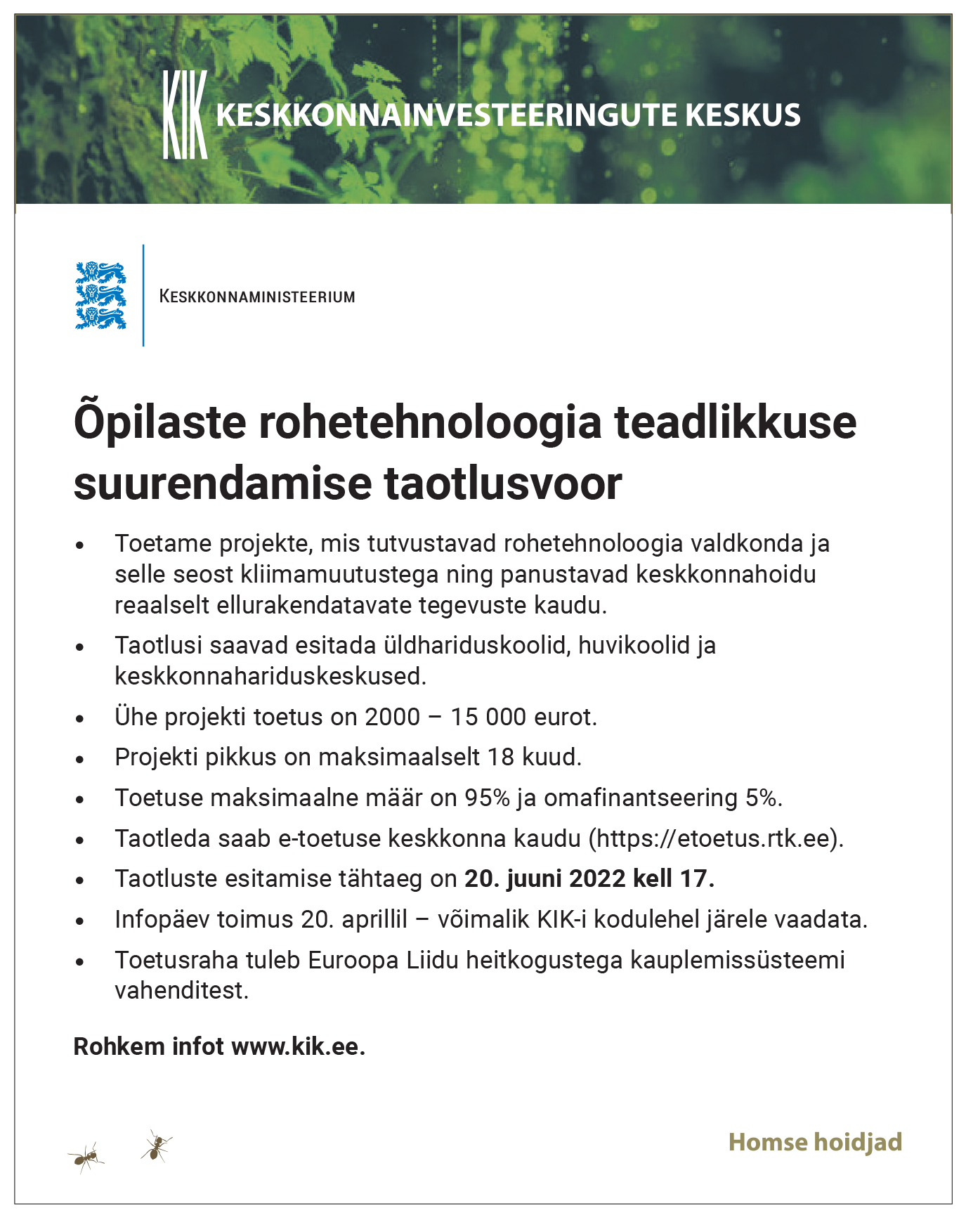 Iga uus projekt ja algatus vajab üldjuhul raha. Seetõttu avab Keskkonnainvesteeringute Keskus (KIK) taas kuni 20. juunini toetuse õpilaste rohetehnoloogia teadlikkuse suurendamiseks. Eelmisel aastal said toetust kuusteist eriilmelist ja loova lahendusega rohetehnoloogiaprojekti üle terve Eesti.