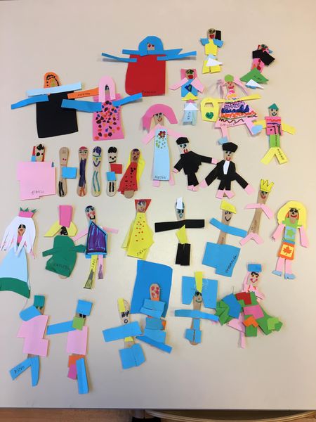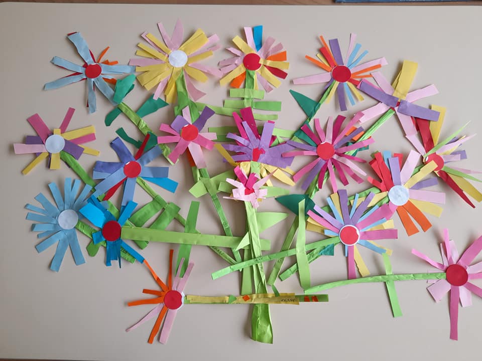 Lastele meeldib ühistöid teha. Ükskord joonistasid nad suure puu, tegid sellele lehetrüki tehnikas lehed külge ning liimisid pildile lilli, linde, liblikaid. Teine kord maalisid suurele tapeedirullile mere ja taeva. Lõikasin merele sisse taskud, kuhu panime ujuma laste joonistatud ja välja lõigatud kalad.