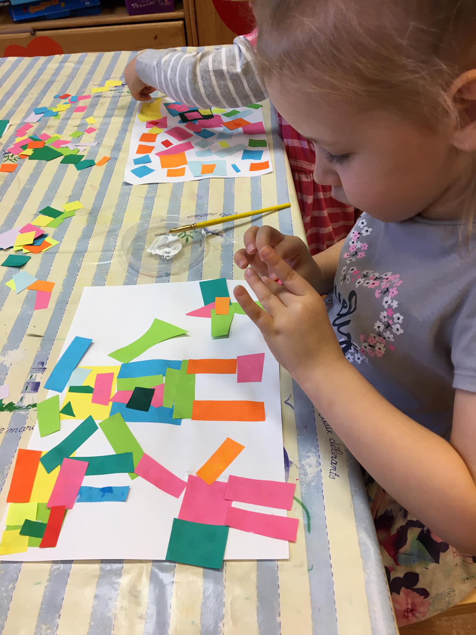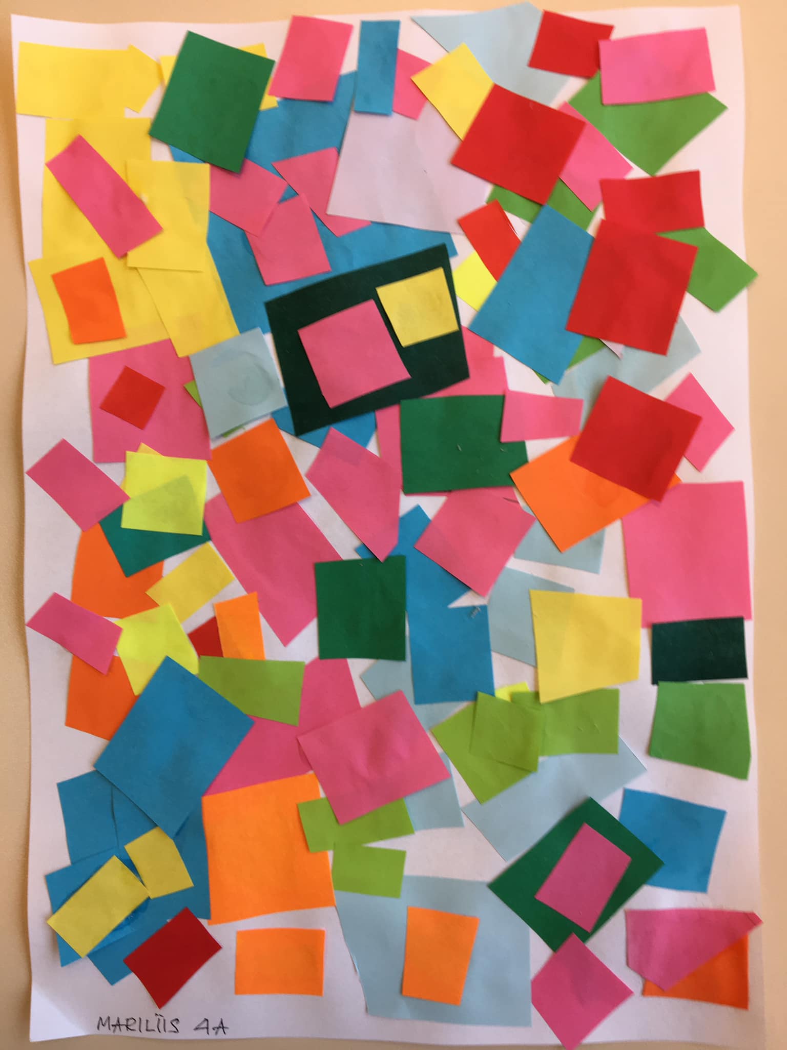 Kuna mulle endale meeldib väga abstraktne kunst, oleme ka lastega abstraktseid pilte teinud. See arendab loovust. Üks ülesanne oli selline, et palusin neil joonlauaga paberile jooni tõmmata: ülalt alla, vasakult paremale, diagonaalis, risti ja rästi. Joonistasin tahvlile samasuguse A4 paberilehe, nagu neil ees oli, ja näitasin, kuidas joonlauda hoida ning jooni tõmmata. Pärast värvisid lapsed kõik tekkinud väikesed ruudud, kolmnurgad ja kujundid eri värvi ja välja tulid põnevad pildid. Seekord kasutasime joonte tõmbamiseks joonlauda, aga oleme ka vaba käega kujundeid või laineid teinud. Samasuguse kujunditest koosneva töö saab teha värvilistest paberitest.