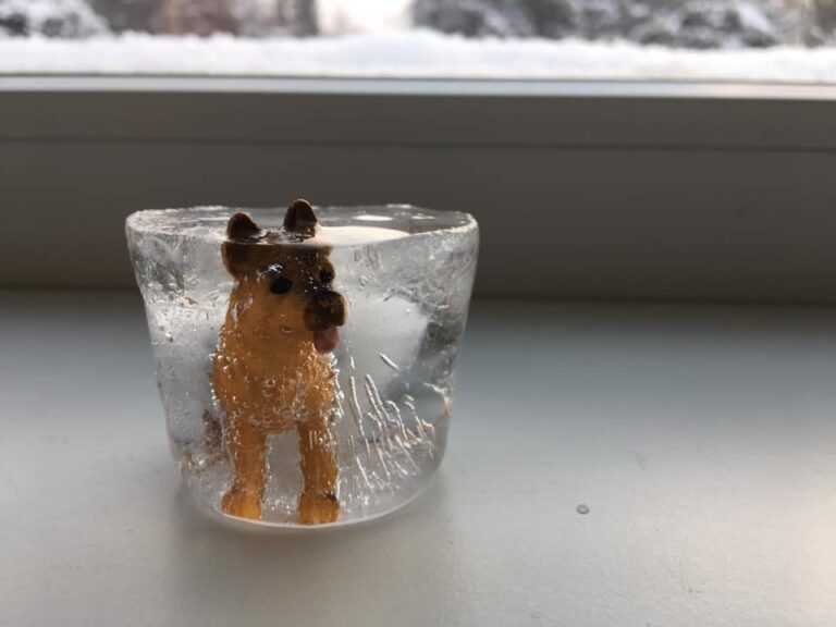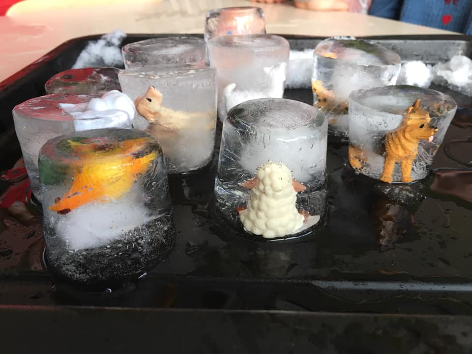 Hästi põnev töö oli jääaeg. Iga laps valis endale pisikese plastmasslooma ja pani selle veega täidetud topsi. Kui vesi õues topside sees ära külmus, kumasid kristalsete jääkuubikute seest läbi loomad. Arutasime, et just nii võiski jääaeg välja näha.