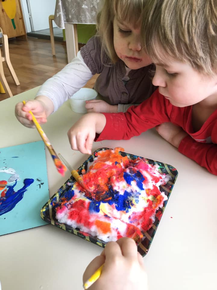 Iga aastaaeg pakub kunsti tegemiseks isemoodi võimalusi. Sel talvel proovisime näiteks lume peale maalida. Teeme palju projektõpet ja tahtsime katsetada, mis lumega soojas toas juhtub. Tõime õuest kandikutega lund tuppa ja lapsed värvisid selle ära. Seejärel lasime lumel ära sulada ja valasime selle vedela värvilise segu topsidesse, panime igasse topsi ka nöörijupi, viisime topsid õue ja lasime veel uuesti ära külmuda. Nii saime ilusad värvilised jäävitraažid, mille sai puude külge riputada.