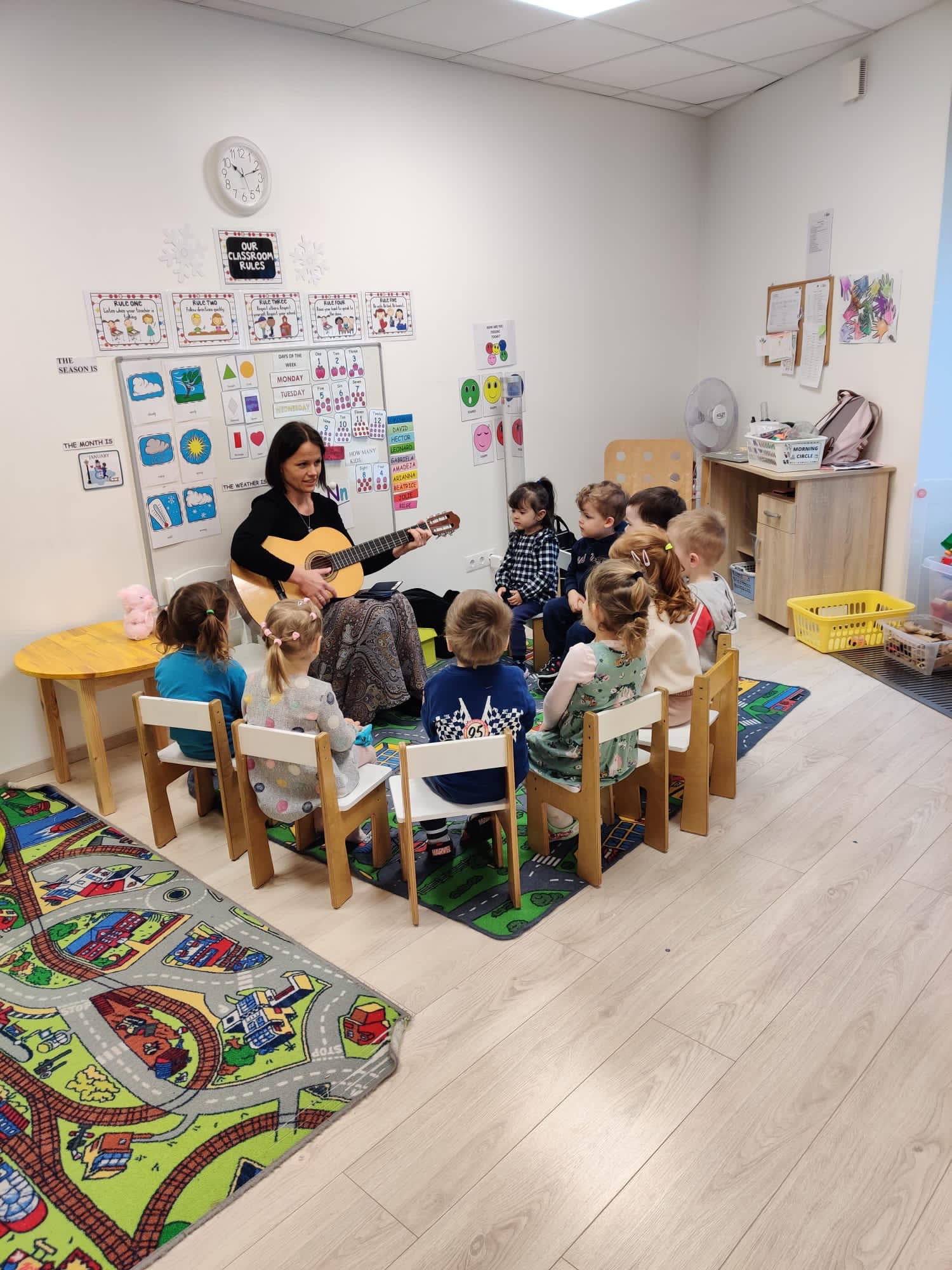 Natalja Lapp: Õpetajad on meil samuti rahvusvahelise taustaga: näiteks Venemaalt, Ukrainast, Mehhikost, Kreekast, Brasiiliast, Venetsueelast, Ameerikast. On olnud õpetajaid Indiast, Bangladeshist ja mujalt. Ainult muusikaõpetaja ja rühmaõpetajatest Sigrit on Eestist. Meie kaader ei ole nii püsiv nagu kohalikes lasteaedades, kus mõned õpetajad on ametis aastakümneid. Meil on peamiselt noored õpetajad, kes julgevad oma elus kardinaalseid muutusi teha, ka teise riiki tööle minna. Mingil ajal loovad nad pere ja saavad lapsed. Praegu ongi kaks õpetajat lapsehoolduspuhkusel. Väga tähtis kriteerium õpetajate valikul on hea inglise keele oskus. Võib juhtuda, et ennast tuleb tööle pakkuma hea hariduse ja kogemusega inimene, kes ei oska hästi inglise keelt. Või vastupidi, valdab suurepäraselt inglise keelt, aga pole pedagoogilist haridust ega kokkupuudet lastega. See teeb inimeste leidmise raskeks.