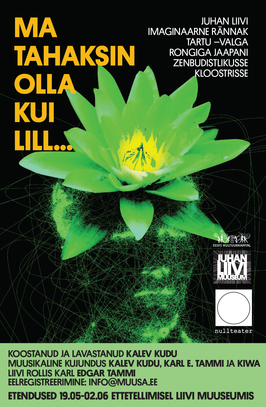 Kalev Kudu loodud autorilavastuses „Ma tahaksin olla kui lill …“ alustab Juhan Liiv rännakut Tartu-Valga rongis, kuid jõuab välja jaapani zenbudistlikku kloostrisse. Etendus põhineb suuresti Liivi luulel, on põimitud luuletaja elulooliste seikadega ning ka publik saab võimaluse kaasa rääkida. Lavastuse toob välja nullteater. Lavastuse on muusikaliselt kujundanud Kalev Kudu, Karl Edgar Tammi ja Kiwa, Liivi ja iseennast mängib Karl Edgar Tammi.