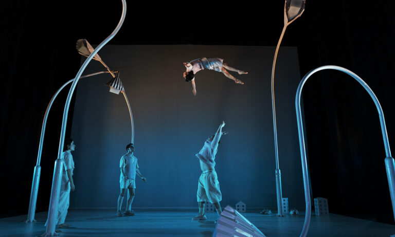 Näitlejate imetlusväärne füüsiline jõud ja kontroll lõid illusiooni sellest unenäoilmast, kus gravitatsioon vaid hellalt äiutab tagasi maapinnale. Üksteist toetades ja neidsamu tänavalampe kasutades kerkivad nad ikka ja jälle üles lae alla, luues uusi ja uusi kujundeid. Ent kindlasti pole tegu mehaanilise oskuste demonstreerimisega – iga liigutuse taga on mängulisus, mingi emotsioon, mingi tähendus. Ettearvamatult valus koht lavastuses oli stseen, kus üks tegelastest püüdis maja servalt alla hüpata. Teised küll üritasid teda takistada, ent tahtmatult tegi hüppaja hoopis neile üha enam haiget – kuni lõpuks võitlus rauges ja anti alla. Katrin Boye sooritas enesetapu. Muidu malbes ja maalilises kontekstis mõjus säärane pilt üsna šokeerivalt. Võib-olla oligi seda šokki tarvis.