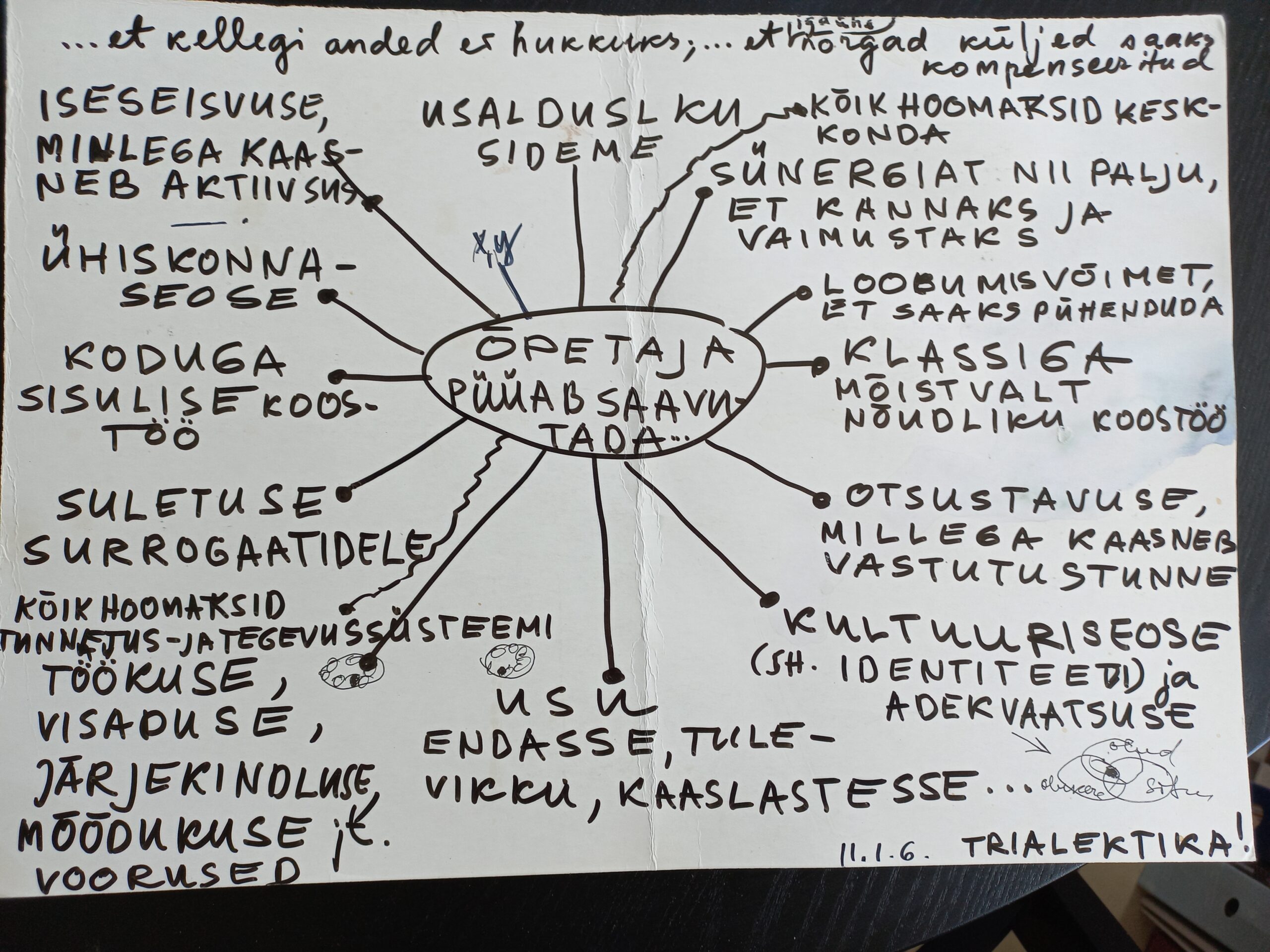 Just nagu jah, aga see, mis toimub õpetatava sisuga, on eriliselt keerukas. Mina praegu selles intervjuus ju ka ei õpeta kedagi, aga ma näitan, kuidas asjadest aru saan, miks ma niimoodi mõtlen ja ühte-teist küsimust käsitlen. Ja kui selles jutus on tera, mis väärib tähelepanu, edasi mõtlemist, siis lugeja mõtleb.