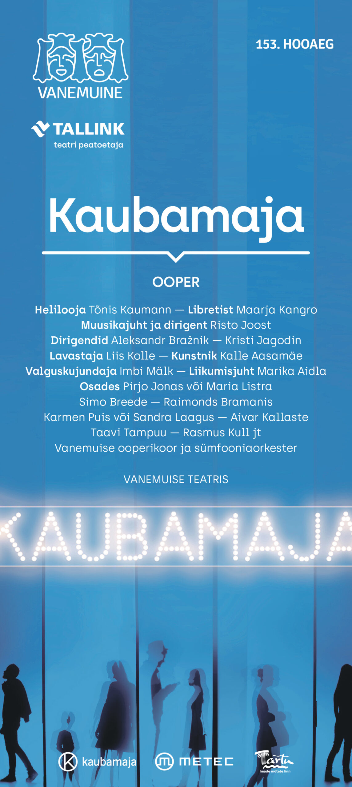 „Kaubamaja“ eri koosseisudes näeb ja kuuleb Pirjo Jonast või Maria Listrat, Simo Breedet, Raimonds Bramanist (Läti RO), Taavi Tampuud, Karmen Puisi või Sandra Laagust, Rasmus Kulli, Aivar Kallastet ja teisi. Laval on Vanemuise ooperikoor ja sümfooniaorkester. Muusikajuht ja peadirigent on Risto Joost.