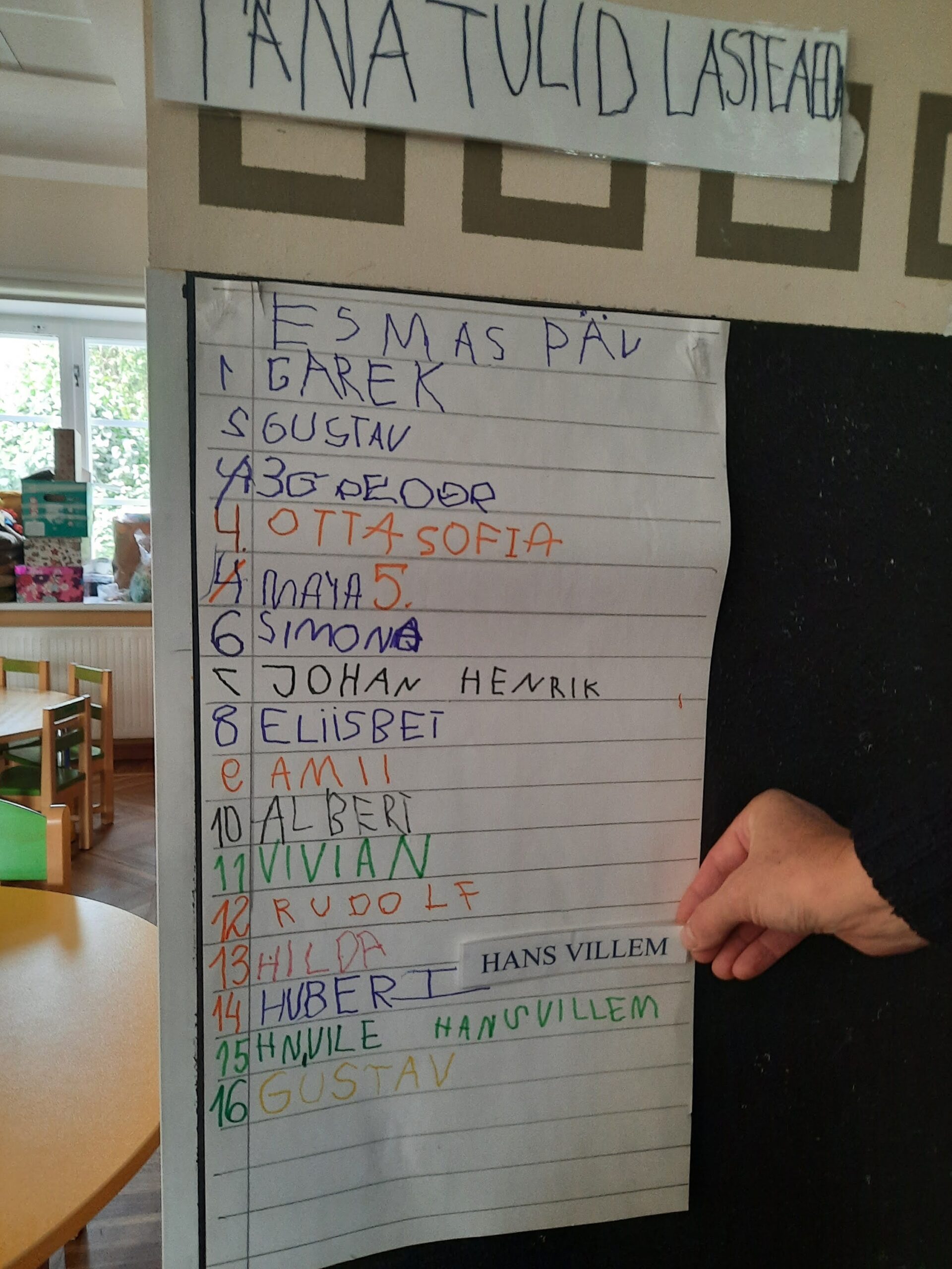 Mõnusaks hommikuseks rutiiniks on saanud igahommikune nime kirjutamine, mille käigus on võimalik arendada häälimisoskust, harjutada ärakirja ja loendamist, luua seos arvu ja numbri ning hääliku ja tähe vahel, juhtida lapse tähelepanu tähtede ja numbrite õigetele joonistamissuundadele. Väiksemad lapsed, kes rühmaga alles liitunud, kinnitavad seinale oma pildiga nime. Õpetajale annab see hea ülevaate lasteaeda tulnud lastest.