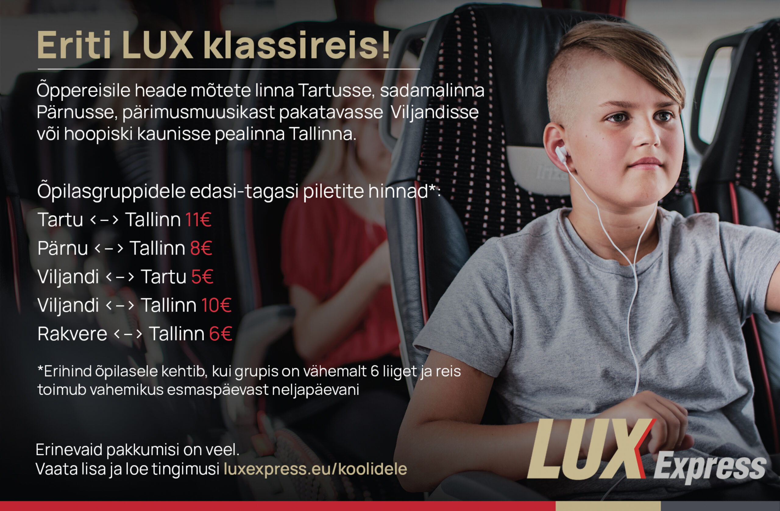Sellest ideest kannustatuna pakub Lux Express nüüd õpilasgruppidele võimalust sõita enda kaugbussiliinidel edasi-tagasi väga soodsa hinnaga. Näiteks klassiga Tartust Tallinnasse ja tagasi saab Lux Expressiga sõita hinnaga 11 eurot õpilase kohta. Õppekäikude eripakkumisega on võimalik sõita esmaspäevast neljapäevani.