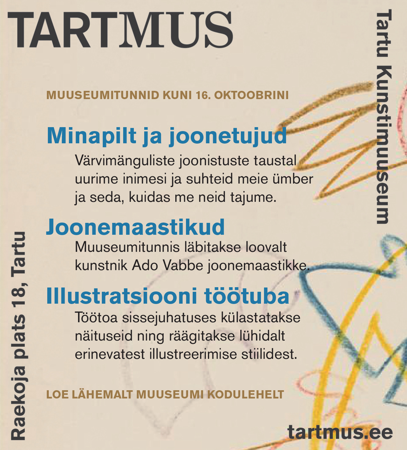Ka teistel 1.–4. klassidel on võimalik projektist osa saada. Seda ennekõike muuseumitundide kaudu, mis saadavad juba sellel ja järgmisel aastal valitud Tartu Kunstimuuseumi näituseid. Septembrist oktoobri keskpaigani on programmis Ado Vabbe näitusel muuseumitund „Minapilt ja joonetujud“, kus kohtuvad loov eneseväljendus ning omavahelise suhtlusruumi märkamine. Lisainfo muuseumi kodulehel tartmus.ee. Järgmised tunnid valmivad 2023. aastal.