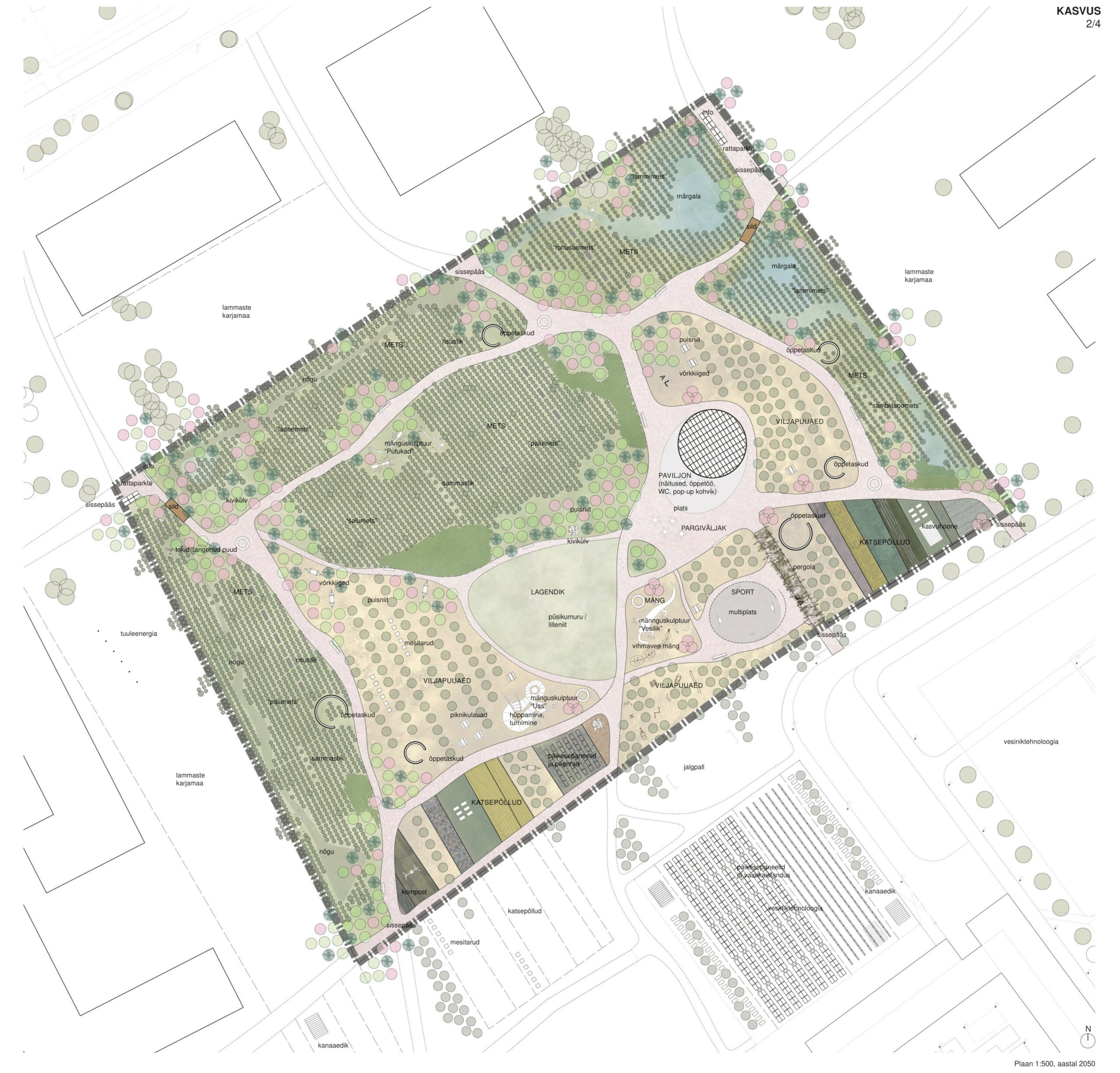 Võidutöö „Kasvus“ autorid on Häli-Ann Tooms, Róbert Schuck ja Martin Allik (MARELD Landskapsarkitekter AB). Töö suur pluss on ümbritsevat avarat ala tasakaalustava haljasmassiivi nutikas etapiviisiline rajamine. Orgaaniline lahendus on kontaktala võimalike muudatuste suhtes paindlik ning pakub rohkelt mänguruumi seniste liikumissuundade ja funktsioonide muutmiseks ja uute loomiseks. Igal nurgal uusi elamusi ja ootusärevust pakkuv pargiruum on lahendatud inimsõbralikult ja loodust säästvalt. Keskkond on nüansirikas, kuid mitte ülepakutud. Looduslikud ja tehiselemendid sulanduvad sujuvalt üheks tervikuks.