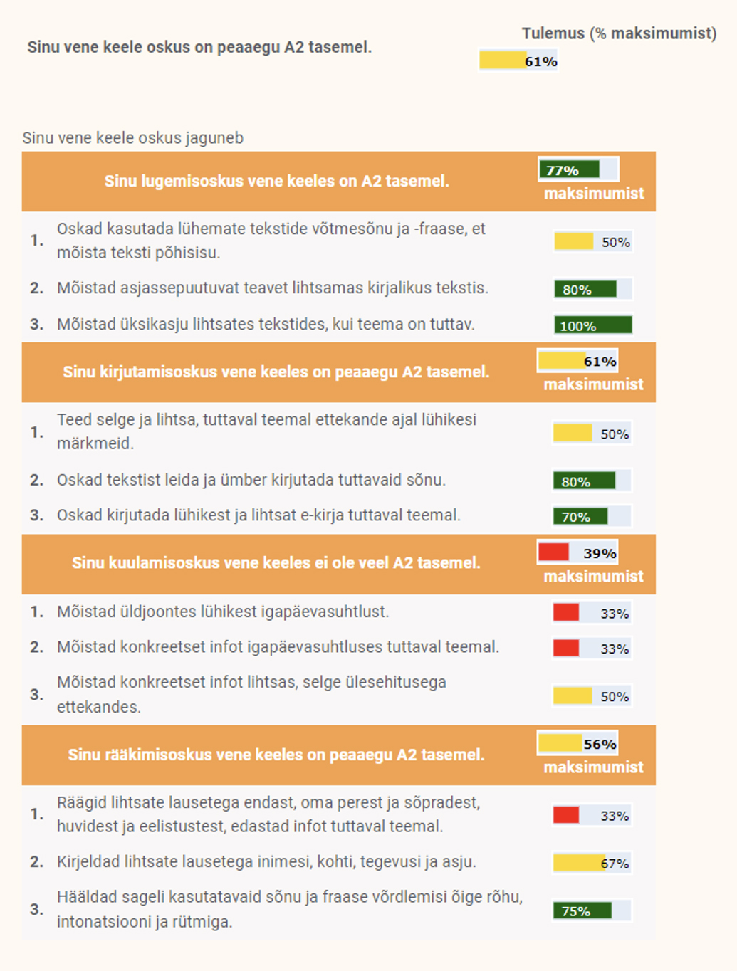 • sinu vene keele oskus on peaaegu A2-tasemel. (50–69%)