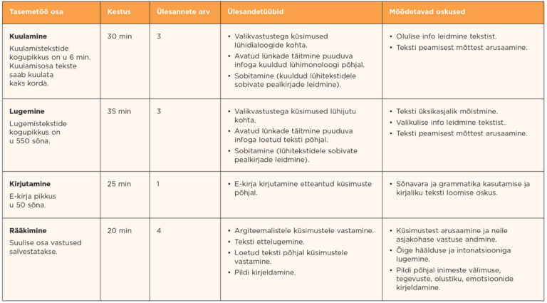 Tasemetöö koosneb kirjalikust ja suulisest osast. Kirjalik osa sisaldab kuulamis-, lugemis- ja kirjutamisülesandeid, suuline osa rääkimisülesandeid. Testi sooritamiseks on vaja internetiühendusega arvutit, mikrofoniga kõrvaklappe ja venekeelset klaviatuuri. Tasemetööst annab täpsema ülevaate tabel.