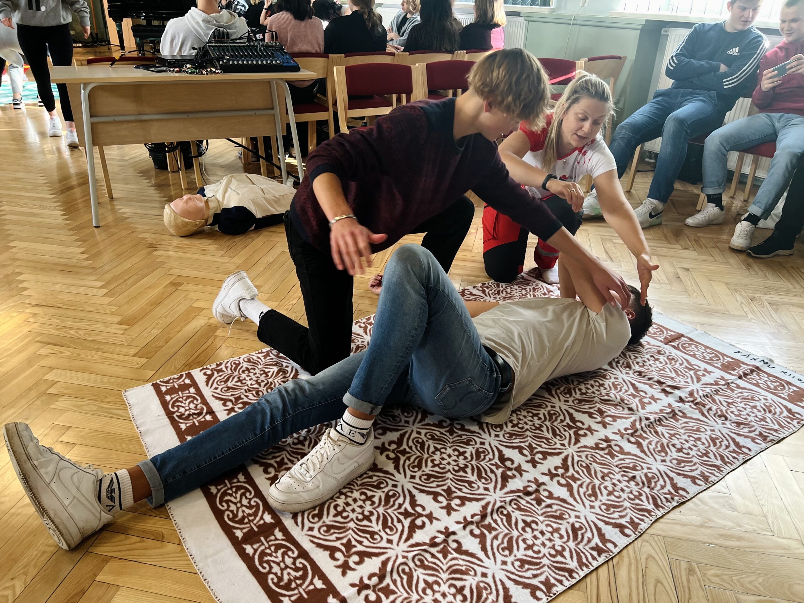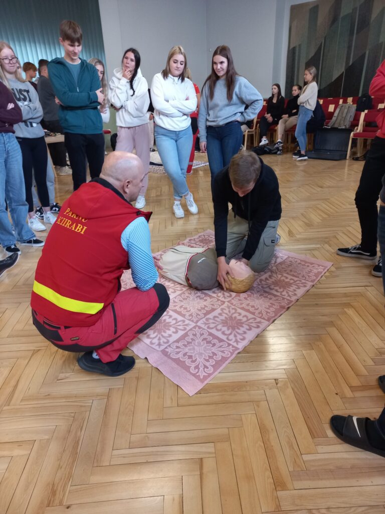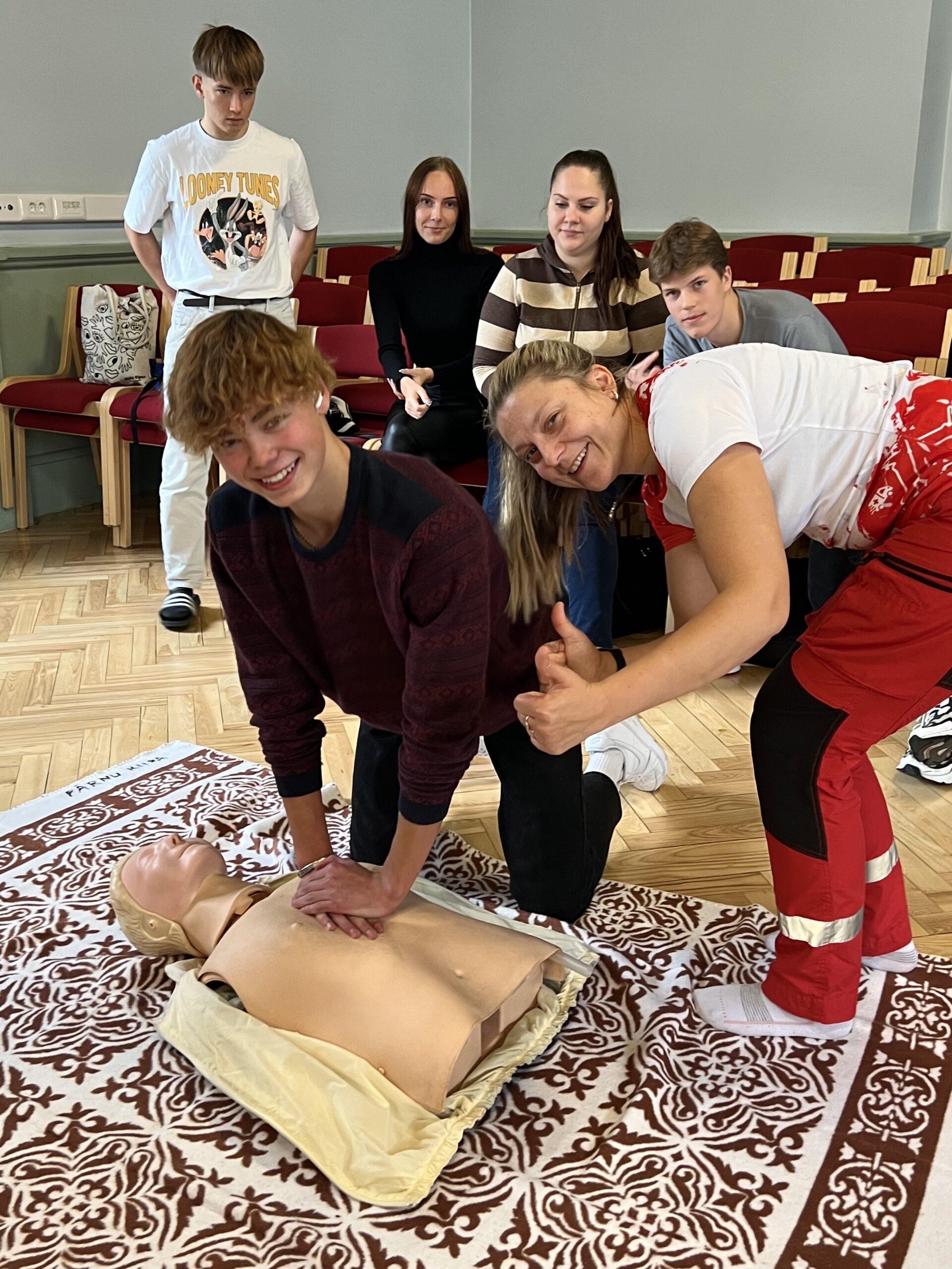 60 gümnasisti, igast klassist viis, kogunesid saali, et omandada esmaabioskusi. Sellega osales kool projektis „Sinu käed päästavad elu“, tutvustas sündmust kooli arendusjuht Kriste Talving. Tema jutust selgus, et üle-eestilise ettevõtmise vastu on koolidel huvi suur ning tuli kärmelt tegutseda, et oma kool soovijate nimekirja saada. Pärnu kiirabi on PÜ koolijuhtide silmis hariduse sõber, sest on samas õpetanud vajalikke oskusi ka pedagoogidele. Vahepeal on olnud koroona-aastad ja esmaabikoolitust saanud noored on kooli juba lõpetanud, rääkis Talving, kelle sõnul on väga tähtis, et koolis oleks õpilasi, kes oskavad tegutseda ootamatus olukorras, kus tuleb kiiresti abi anda.