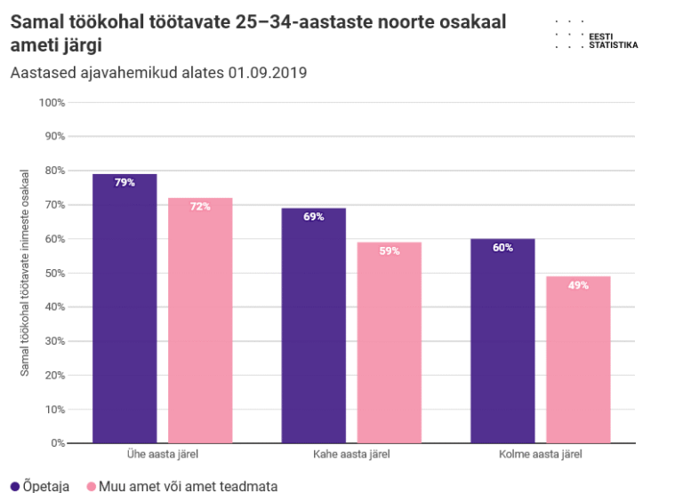 Tulemustest on näha, et õpetajana töötavad noored püsivad nii ühe kui kahe aasta vaates oma töökohal stabiilsemalt kui muudes ametites töötavad noored. 1. septembril 2019 õpetajana töötanud noortest 79% olid samal töökohal ka aasta hiljem, muud ametit pidanud noorte seas oli samale töökohale jäänuid 72%. Kahe aasta vaates oli samal töökohal töötanute osakaal vastavalt 69% ja 59%. Kolme aasta järel oli 2019. aasta töökohal 60% õpetajatest, kuid vaid pooled muud ametit pidanud noortest. Seega on näha, et töökohtade vahetamine ongi noortele omane ja õpetajad ei paista siin kuidagi negatiivselt silma.