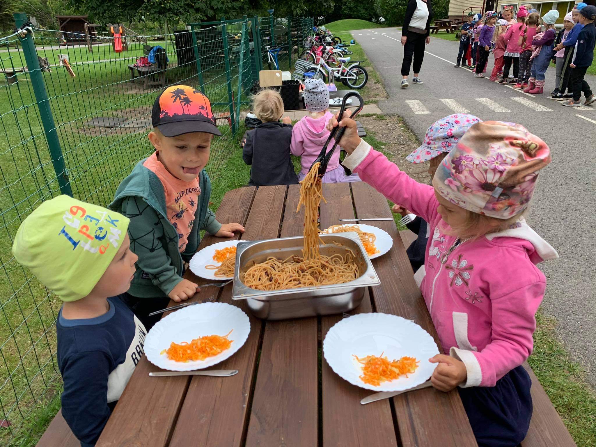 Seekord lahendasime asja nii, et ostsime nõude tarvis ratastel kärud. Praegu toob iga laps juba ise oma toidunõud ülakorruselt õue ja viib pärast tagasi.
