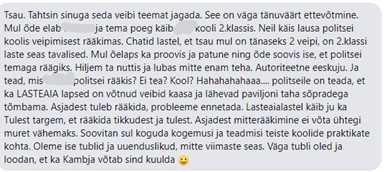 Pärast üht oma sotsiaalmeediapostitust, sattusin lausa üleriigilisse arutellu. Nüüdseks oleme selle teema tõstatanud ka haridus- ja teadusministeeriumis, sotsiaalministeeriumis ning Tervise Arengu Instituudis. Samuti on kohtumisel osalenud Eesti Koolijuhtide Liidu esimees. Usun, et õige pea on tulemas abistavaid materjale, vähemalt koolile ja lastevanematele. Tihtipeale ongi näha, et suur probleem on just lastevanemate vähese teadlikkusega.