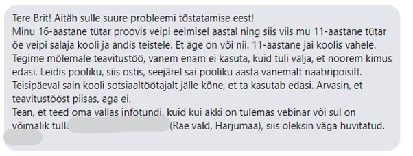 - Kui vanematelt uuriti, kas nad teavad, et laps veipimisega tegeleb, vastati jah. Nende kodus pidi normiks olema, et lapsed saavad söögilaualt vabalt eri maitsega e-suitse võtta. Lapsed seal peres 11- ja 14-aastane.