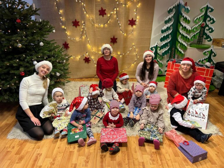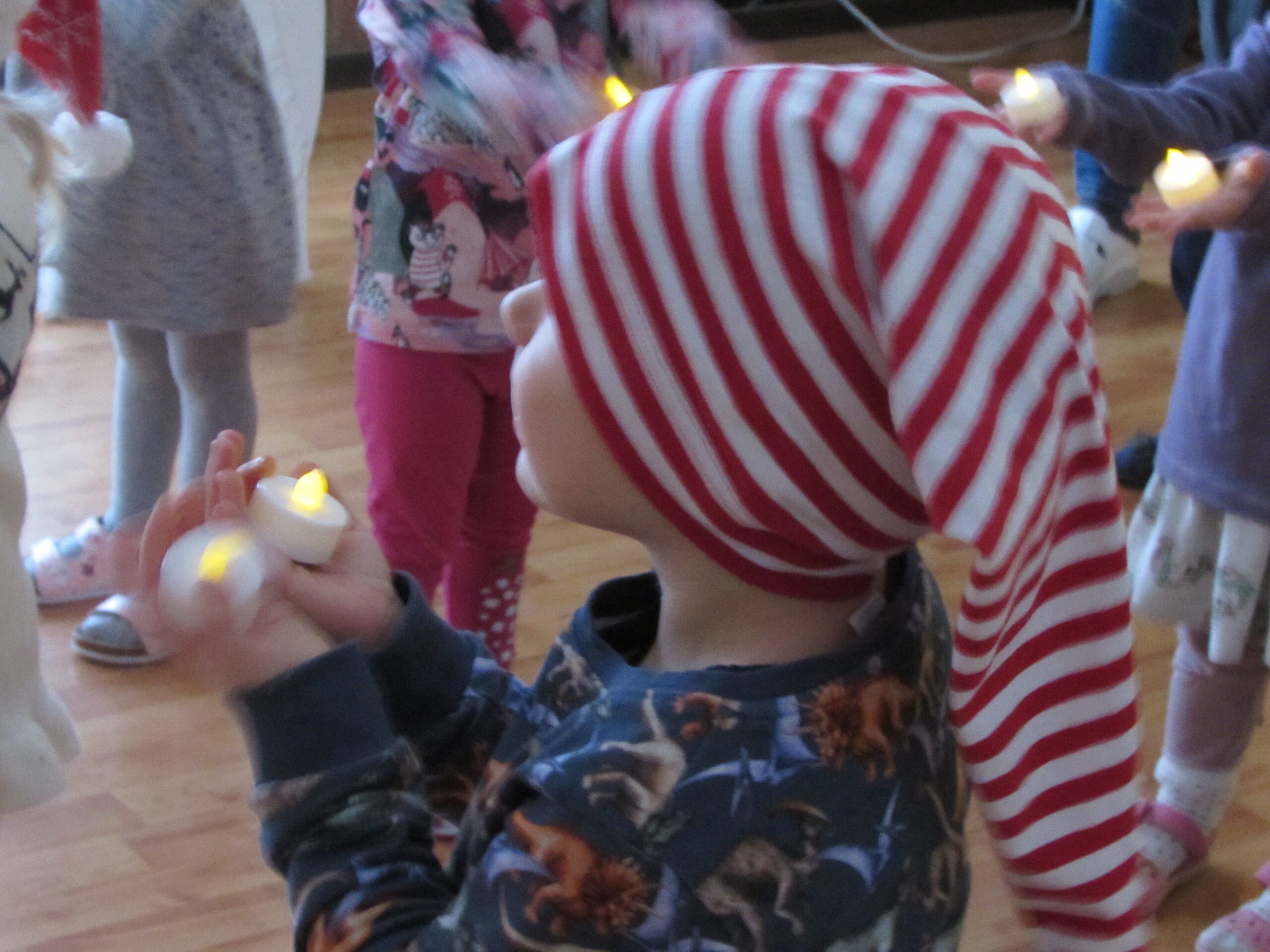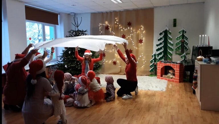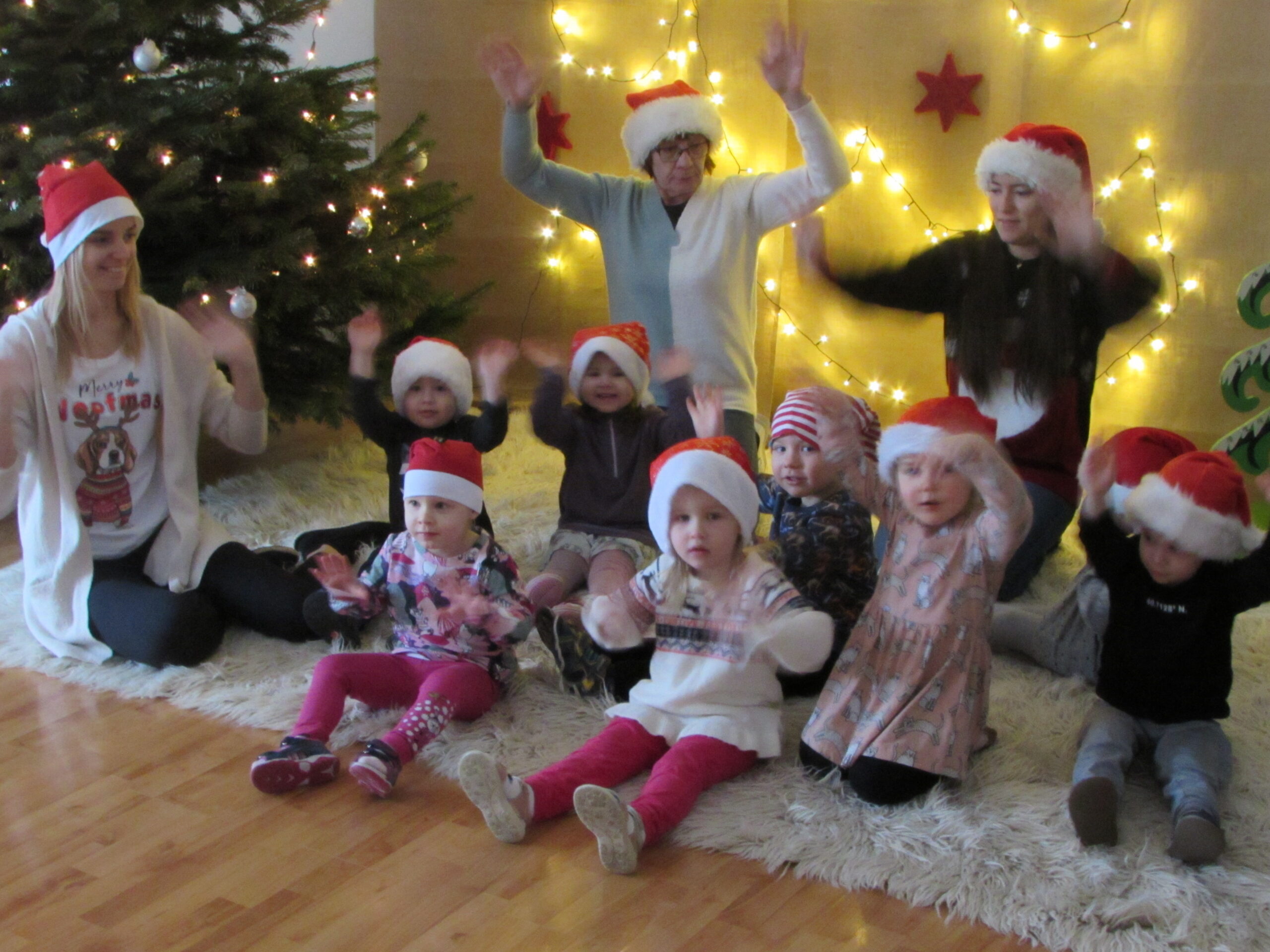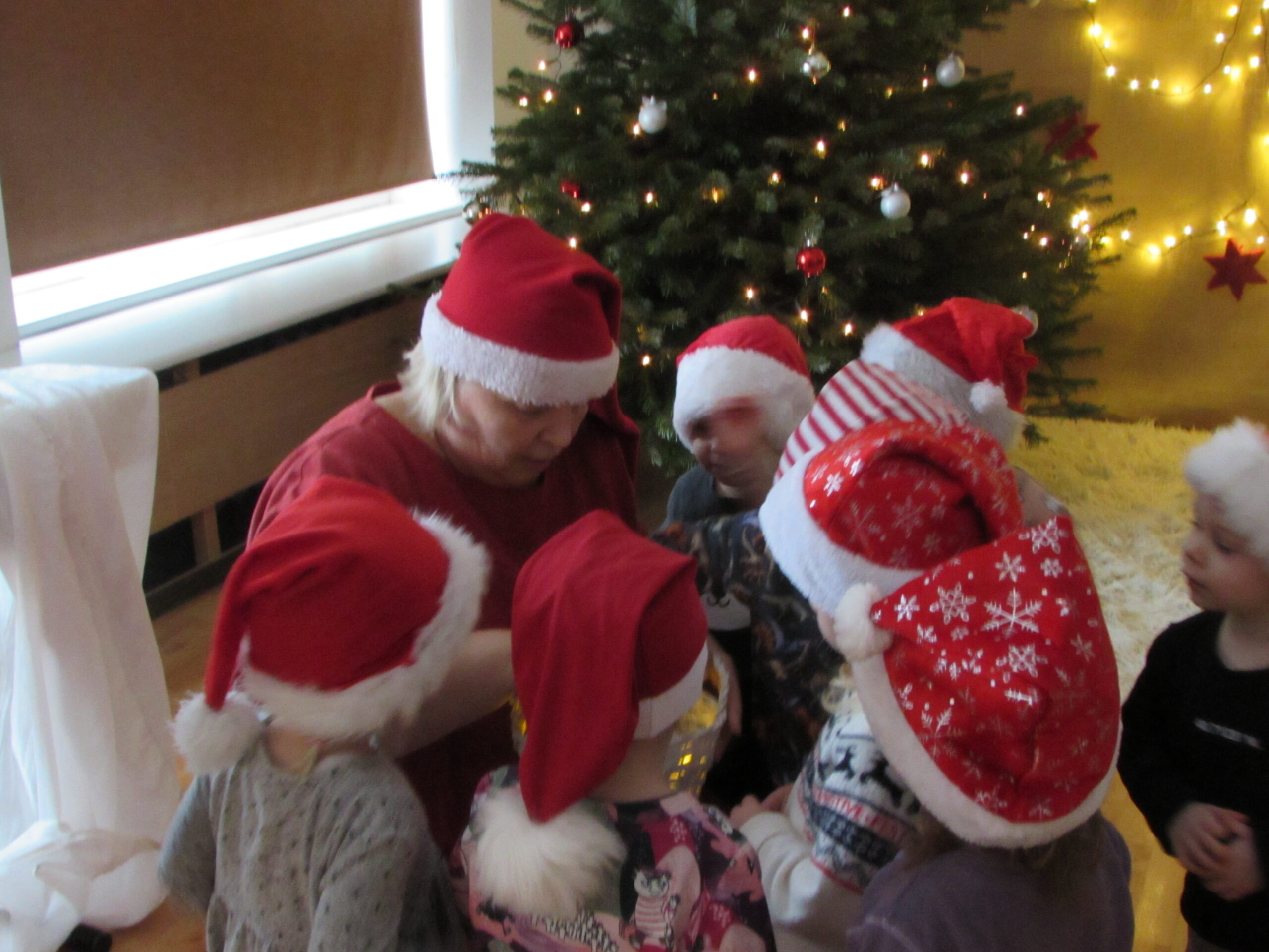 Tallinna Linnupesa lasteaia saalis on ilus ehitud jõulupuu ja põrandal pehme valge vaip. Laululinnu rühma kahe-kolmeaastased mudilased, punased päkapikumütsid peas, tulevad koos oma õpetajate Hele ja Marini ning õpetaja abi Sirjega laulma ja mängima.