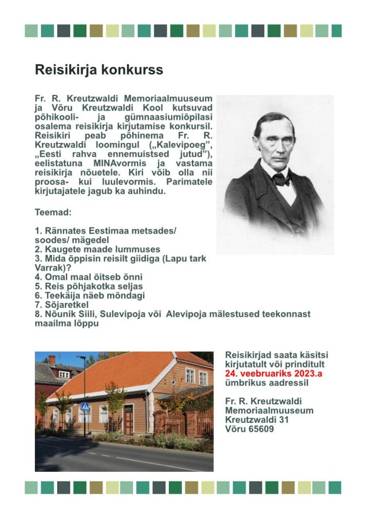 Kreutzwaldi mälestuspäeval, 14. detsembril 2022 austati Kreutzwaldi mälestusmedaliga eesti keele ja kirjanduse õpetajaid Helena Linnamäed ja Raili Leesalu, kellega muuseum on aastaid koostööd teinud. Samal päeval kuulutati välja reisikirjade kirjutamise võistlus eesmärgiga suunata noori Kreutzwaldi loomingut avastama ja tänapäevaga seostama. Julgust selleks andis eelmine õnnestunud kirjakonkurss, millest võttis osa 14 kooli ja 77 õpilast. Kokkuvõtted tehakse emakeelepäeval. Kõik tööd säilitatakse Kreutzwaldi muuseumi arhiivis.