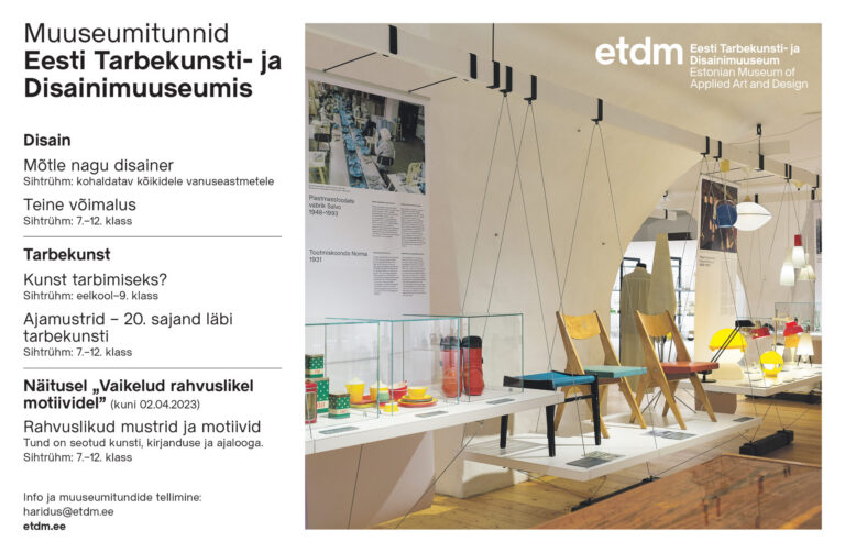 Tarbekunst ja disain on põnevad valdkonnad, mis mõjutavad meie elu palju rohkem, kui seni arvata oleme osanud. Disainerid on sündinud maailmaparandajad, kes nuputavad väsimatult, mismoodi mõistlikumalt ja mugavamalt elada. Eesti Tarbekunsti- ja Disainimuuseumi (ETDM) muuseumitunnid tutvustavad igas vanuses õpilastele tarbekunstnike ja disainerite tööd ning mõju meie keskkonnale.