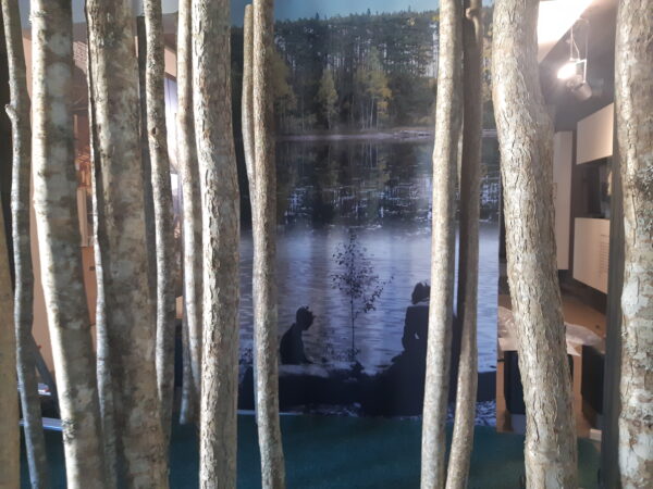 Anna ja Villu istumas keset „Kõrboja peremehe“ näituse puudesalu.