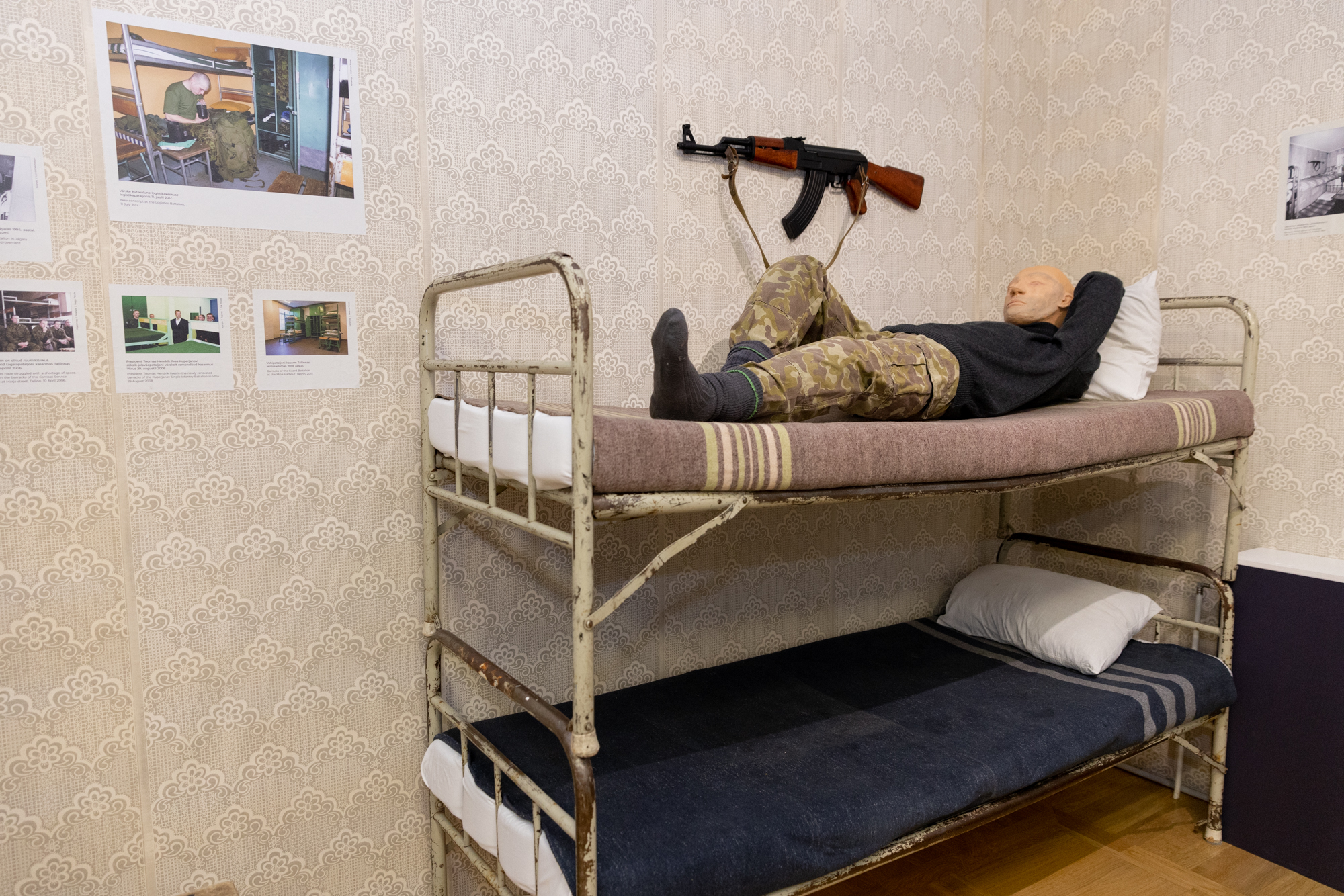 Näiteks jookseb vitriini kõrval, kuhu on pandud välja kaitseväelase varustus aastal 2022, filmilõik aastast 1992, kus kaitseväelase varustust tutvustab Kalevi üksik-jalaväepataljoni 1. kompanii ülem ja pataljoni staabiülema kohusetäitja nooremleitnant Riho Terras, hilisem kaitseväe juhataja.